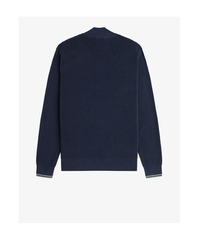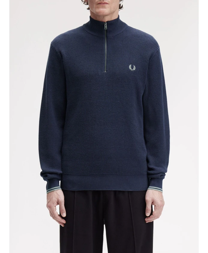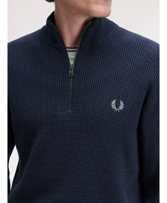 Обновите свой гардероб с помощью этого классического мужского синего свитера Fred Perry из чесаного хлопка. Рельефный узор, вдохновленный геометрией и шахматной доской, добавляет элегантности и изысканности. Свитер с фирменной металлической застежкой-молнией и вышитым логотипом в виде лаврового венка на груди предлагает утонченный и вневременной стиль благодаря стандартному крою и ребристым манжетам.