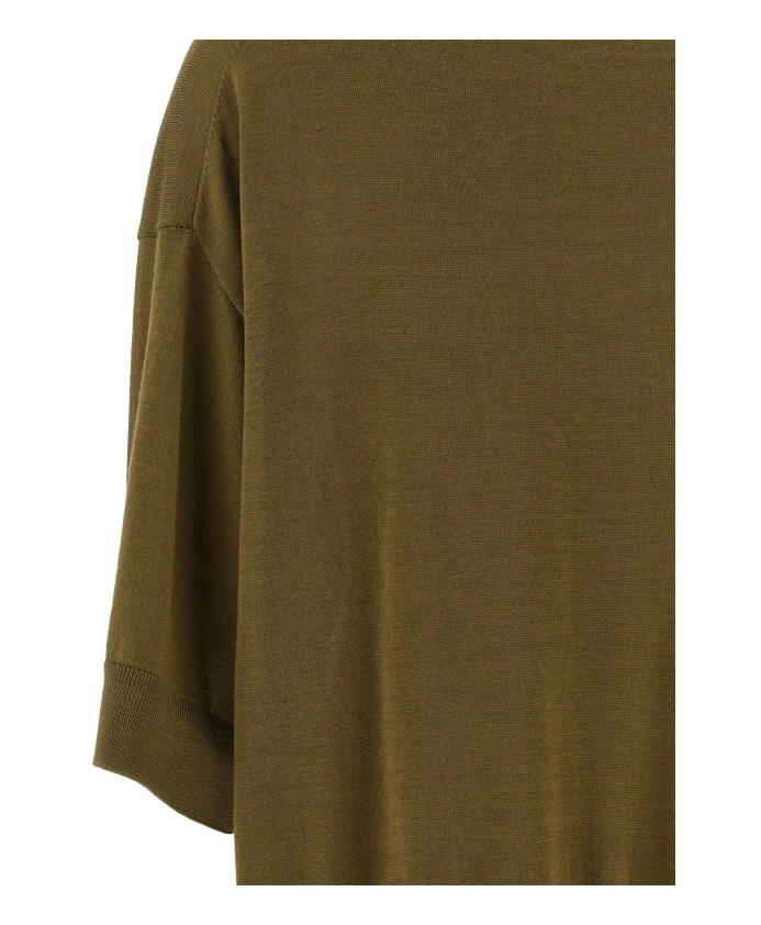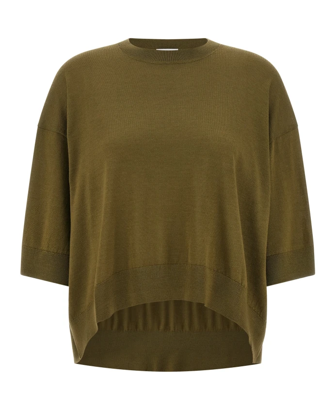 Укороченный шерстяной свитер телесного цвета - это короткий вязаный свитер, созданный для многослойных образов. Он имеет круглый вырез и асимметричный низ для создания современного силуэта. Ключевые особенности: Зеленый | Телесный | Шерсть | Круглый вырез | Укороченный силуэт | Рукава 3/4 с манжетами | Спущенные плечи | Асимметричный низ | Состав и уход: 100% шерсть