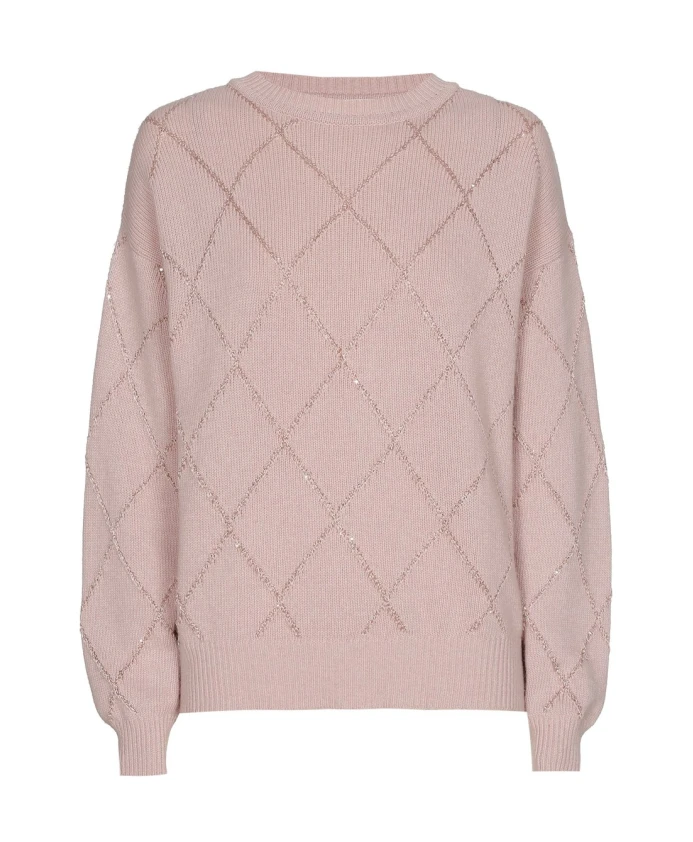 Элегантный розовый свитер с нежным клетчатым узором и вкраплениями люрекса для изысканного блеска. Длинные рукава и круглый вырез горловины делают этот вязаный свитер одновременно комфортным и стильным. Его изящный дизайн делает его универсальным предметом гардероба, идеально подходящим как для повседневной, так и для праздничной одежды.