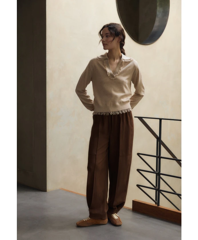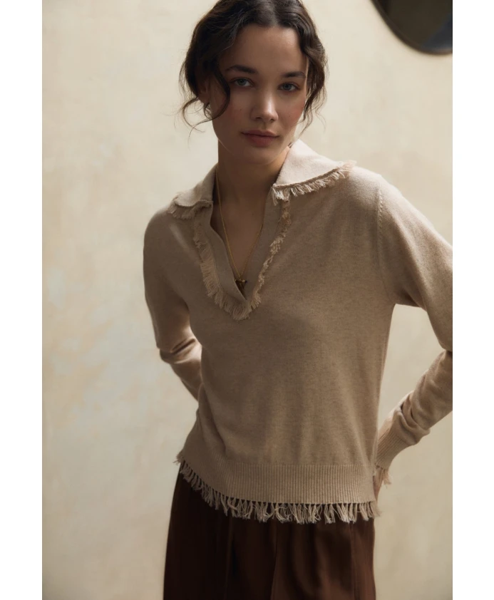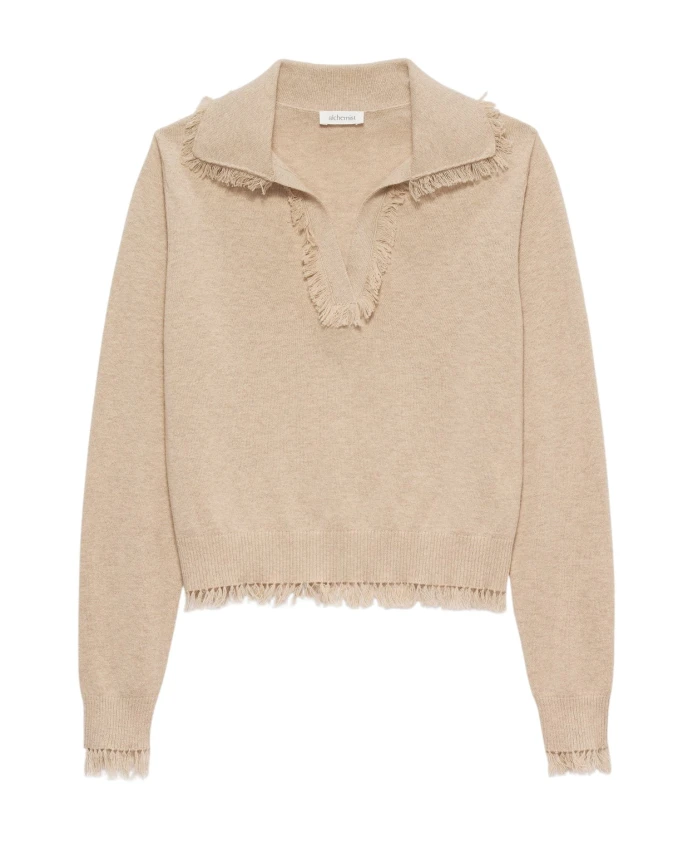 Свитер свободного кроя с V-образным вырезом и изысканным воротником-поло. Бахрома вдоль воротника и рукавов добавляет игривости и стиля. Благодаря сочетанию сверхтонкой мериносовой шерсти и хлопка, свитер невероятно мягкий на ощупь и красиво драпируется. Удобный и оригинальный трикотаж, который без труда прослужит вам весь сезон.
