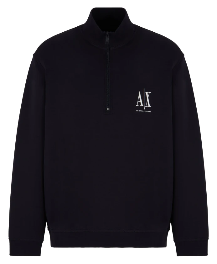 Подчеркните свой повседневный стиль с помощью этой мужской толстовки от Armani Exchange. Изготовленная из смеси 79% хлопка, 17% полиэстера и 4% эластана, она имеет ребристый воротник-стойку, короткую застежку-молнию, приспущенные плечи, ребристые манжеты и нижний край, а также культовый логотип French Terry.