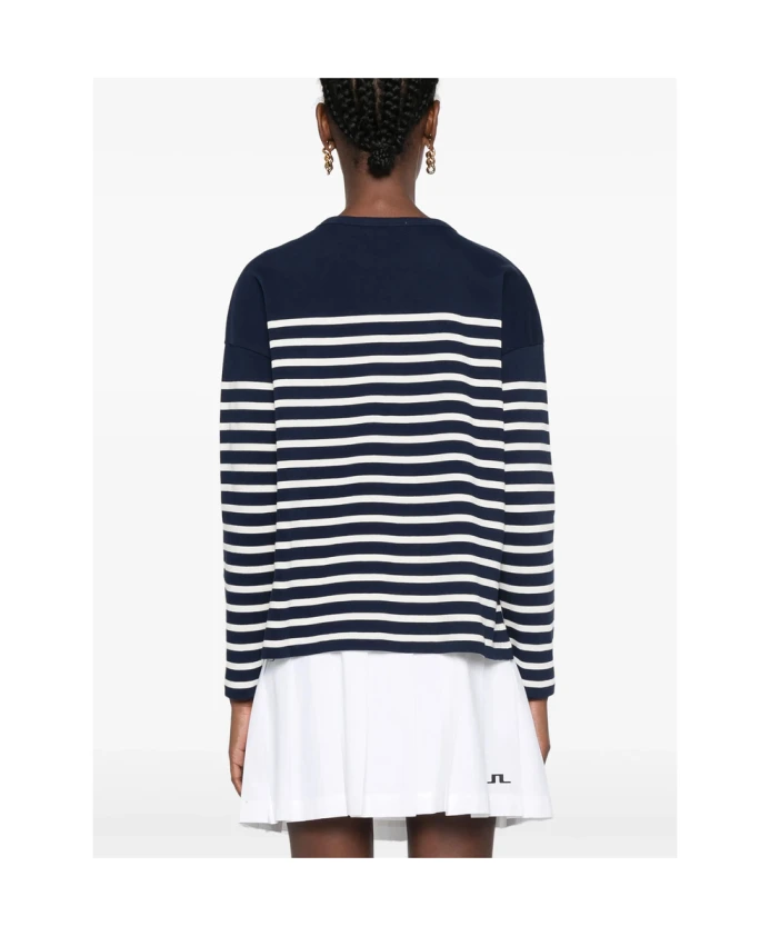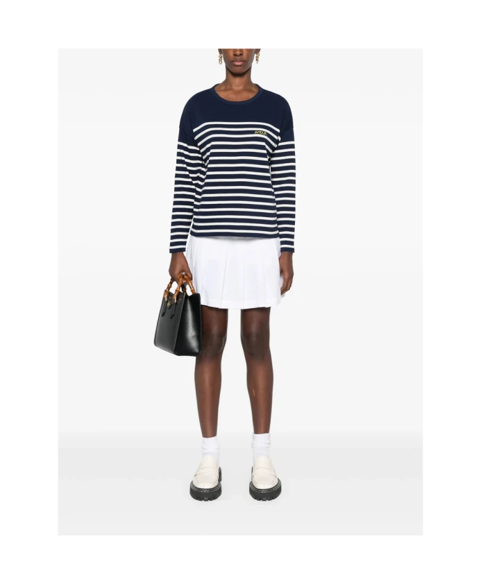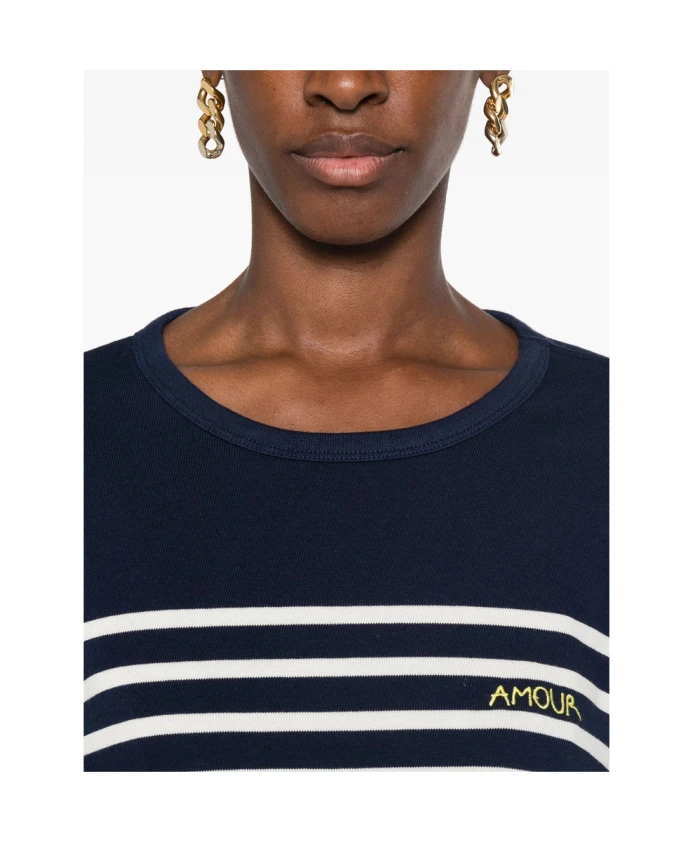 Обновите свой гардероб с помощью этой темно-синей с белым хлопковой блузки с круглым вырезом от Maison Labiche. Стильный узор в виде горизонтальных полос, вышитый логотип на груди, короткие боковые разрезы, приспущенные плечи и длинные рукава делают эту блузку идеальным выбором для модной женщины.