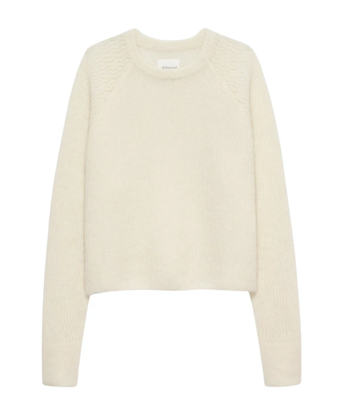 Свитер свободного кроя с рукавами реглан и изысканным ажурным узором, который плавно переходит на рукава. Изделие воздушное и мягкое, красиво драпируется. Изготовлен из роскошной смеси, включающей мягчайшую детскую альпаку и чистую новую шерсть, он легкий, теплый и невероятно комфортный.