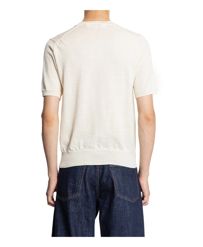 Дополните свой повседневный образ этой легкой шерстяной трикотажной мужской футболкой Comme des Garçons Play с V-образным вырезом. Футболка украшена вышитой нашивкой в виде сердца на груди, имеет короткие рукава, ребристый низ и манжеты, а также облегающий крой.