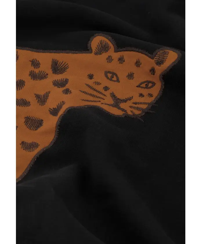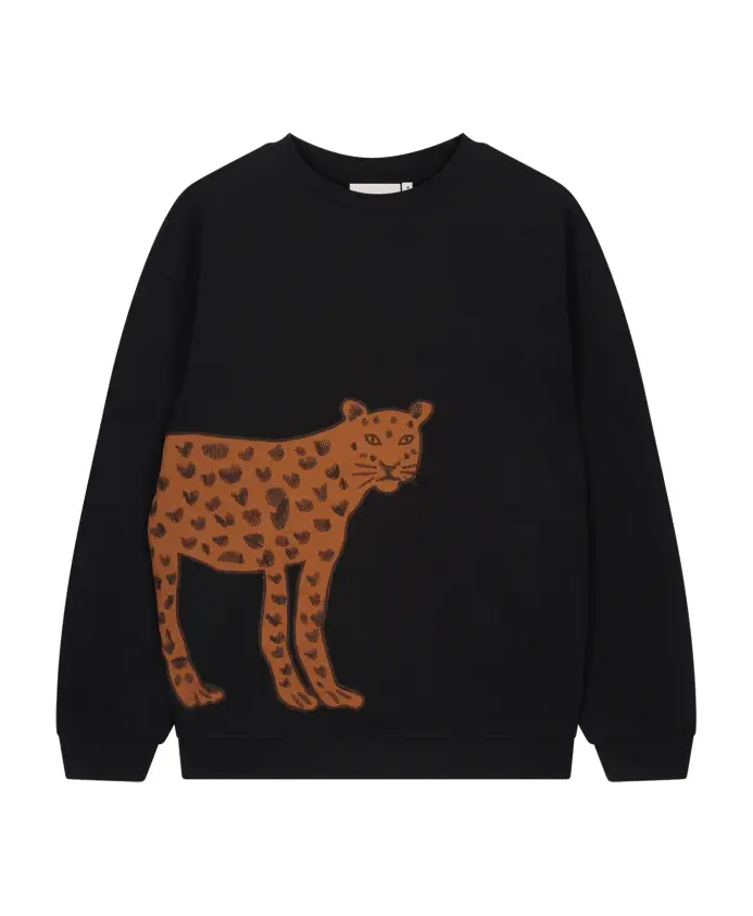 Этот черный свитер изготовлен из 100% органического хлопка и украшен эффектным крупным леопардовым принтом спереди. Мягкая, экологичная ткань обеспечивает комфорт и стильный вид. Сочетайте его с черными брюками для создания элегантного образа.