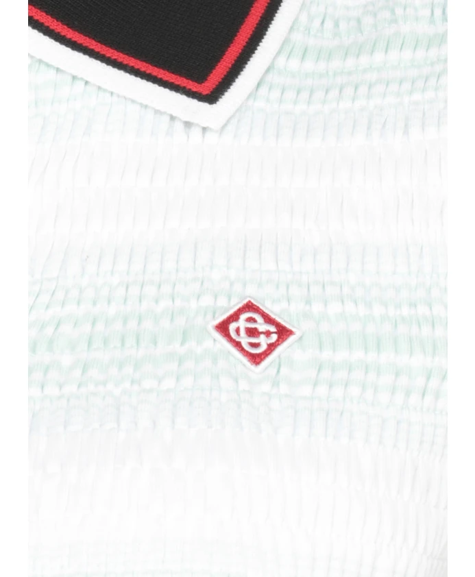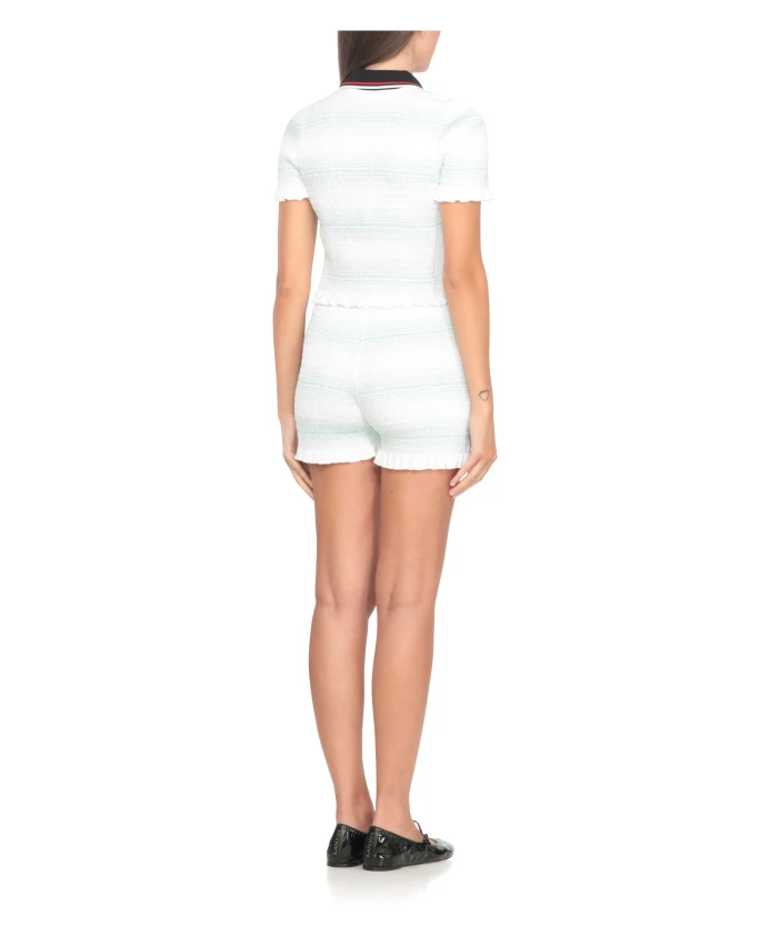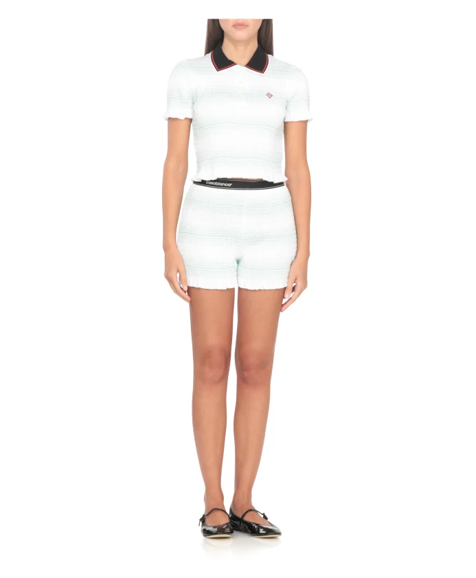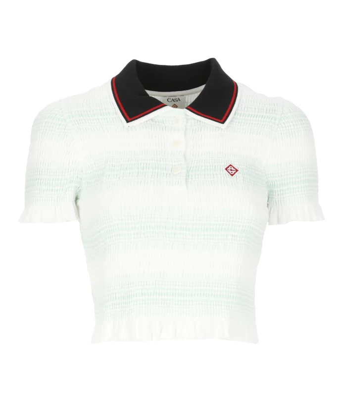 Подчеркните свой стиль с помощью этого белого хлопкового свитера Casablanca для женщин. Модель имеет контрастный воротник и полосатый узор, короткие рукава, логотип спереди и застежку на пуговицы. Рост модели 179 см, размер S.