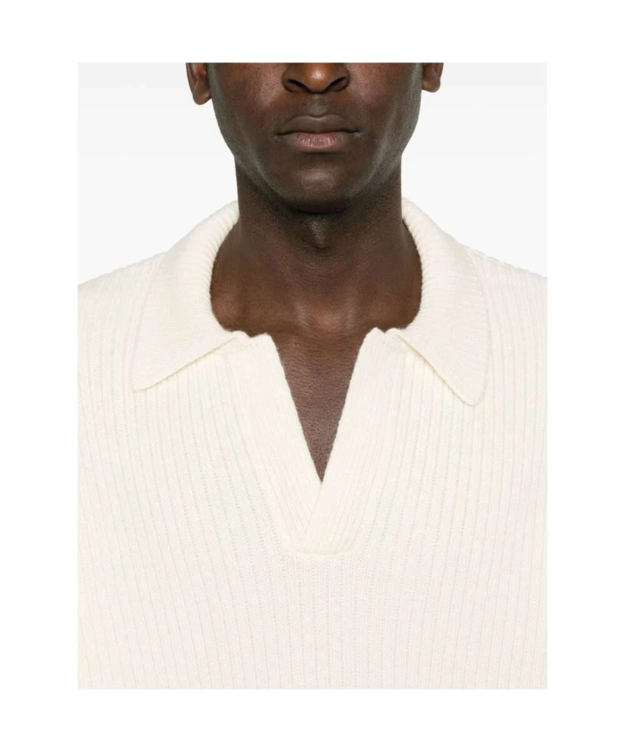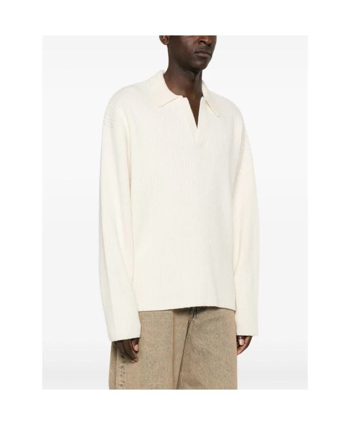 Подчеркните свой стиль с помощью этой белой мужской поло-рубашки REPRESENT из шерстяной смеси в рубчик. Модель имеет отложной воротник, открытый вырез, свободные плечи, длинные рукава, короткие боковые разрезы и прямой низ.
