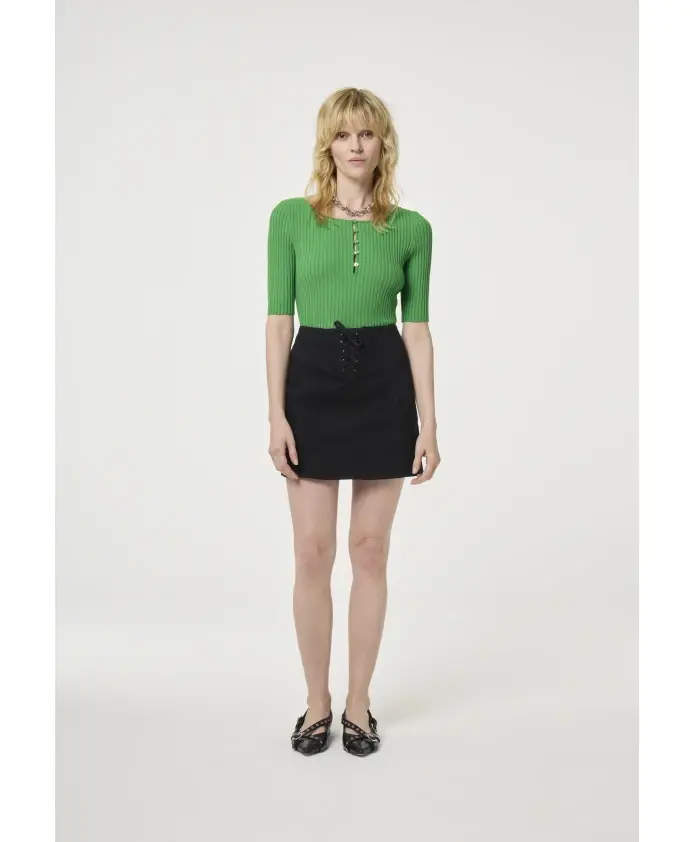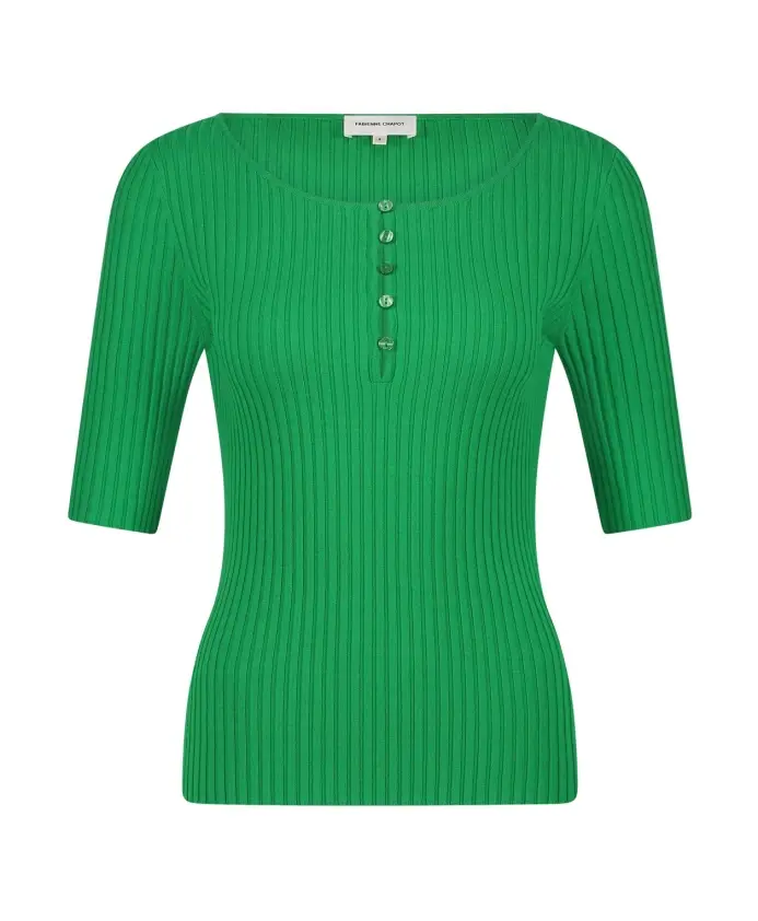Этот тонкий, ярко-зеленый летний свитер с короткими рукавами, благодаря высокому содержанию вискозы, идеально подходит для лета. Короткая застежка на пуговицах и легкий ребристый узор придают свитеру особую изюминку.