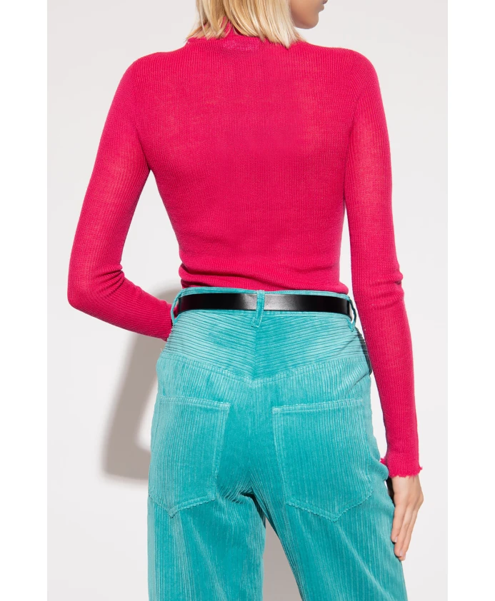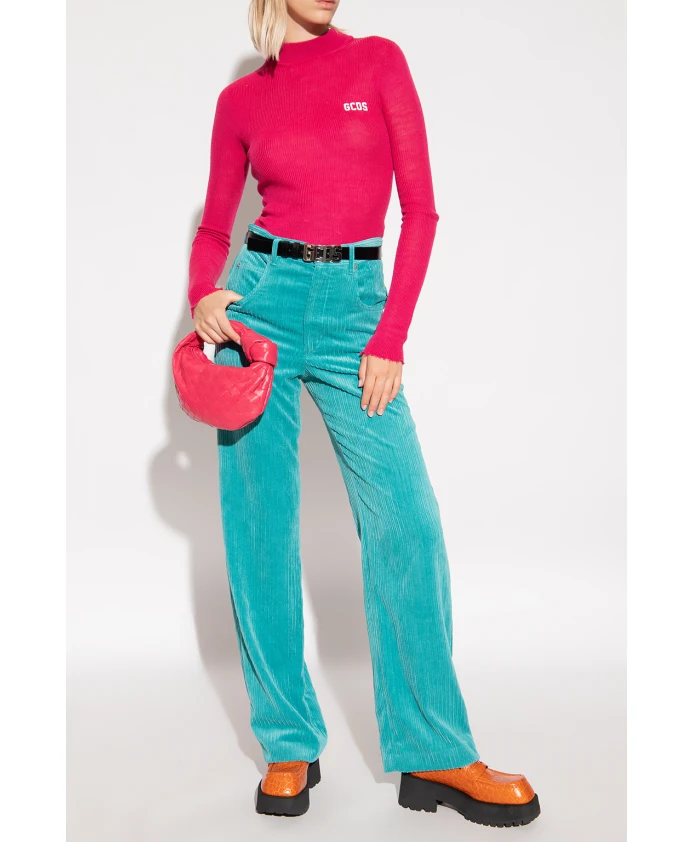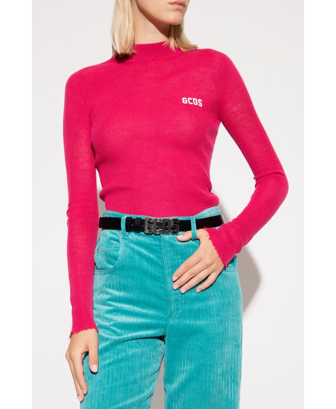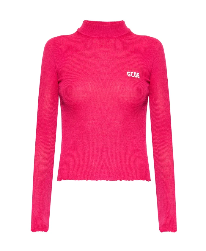 Розовый ребристый свитер от GCDs. Эта модель с длинными рукавами, изготовленная из шерсти, имеет логотип, ребристый круглый вырез и эффект потертости по низу и манжетам. Это описание было переведено автоматически.