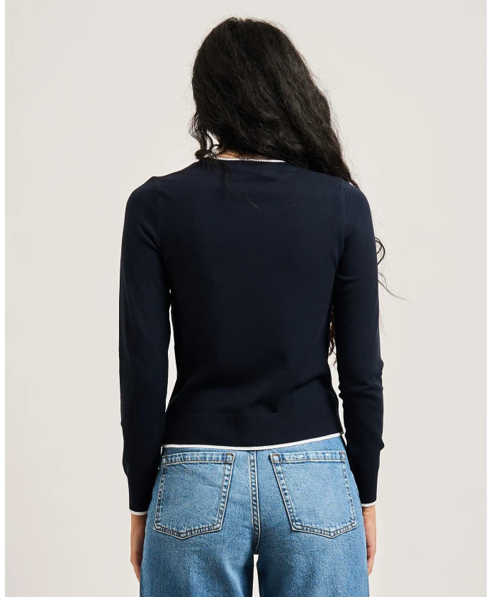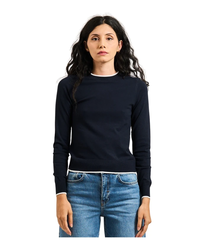 Оставайтесь стильными и в тепле в этом женском вязаном свитере с круглым вырезом от Iblues. Он имеет длинные рукава, контрастную ребристую отделку и стандартный крой. Модель носит размер S и имеет рост 1,70 м.