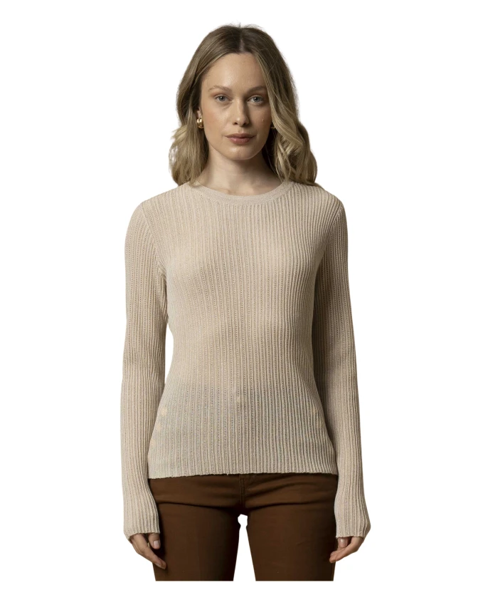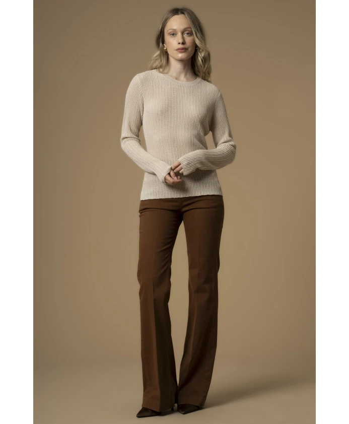 Стильный, облегающий, простой ребристый свитер с длинными рукавами, круглым вырезом, длинными рукавами, узкими манжетами, приталенной отделкой и двойной строчкой по низу. Рост модели 175 см, размер S/42.