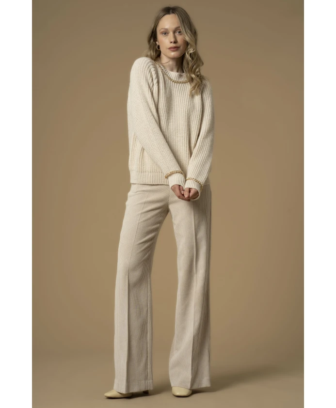 Элегантный, повседневный свитер с длинными рукавами, декоративным узлом, ребристой отделкой горловины, талии и манжет, двойной строчкой и интегрированной цепочкой. Рост модели 175 см, размер S/42.