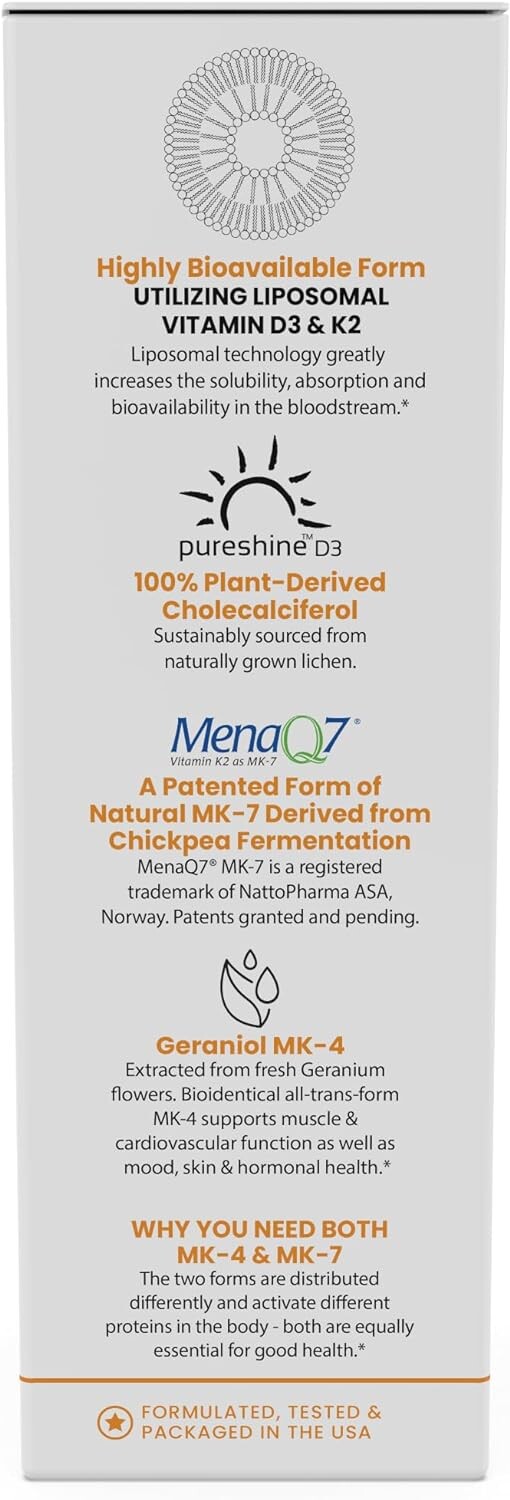 100% липосомальные питательные вещества : использование 100% липосомального веганского витамина D3 вместе с двумя основными формами 100% липосомального веганского витамина K2 (МК-4 + МК-7).