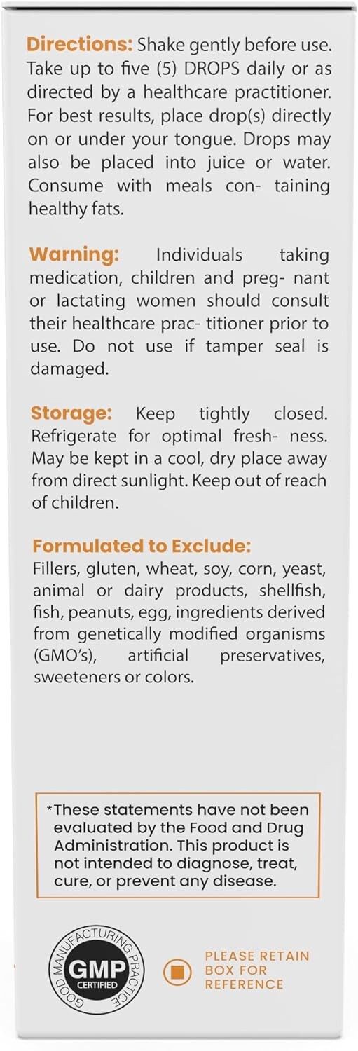 Применение: Аккуратно встряхните перед использованием. Принимайте пять (5) КАПЕЛЬ в день или по указанию врача. Для достижения наилучших результатов закапывайте капли прямо на язык или под него. Капли также можно добавлять в сок или воду. Употребляйте с едой, содержащей полезные жиры.