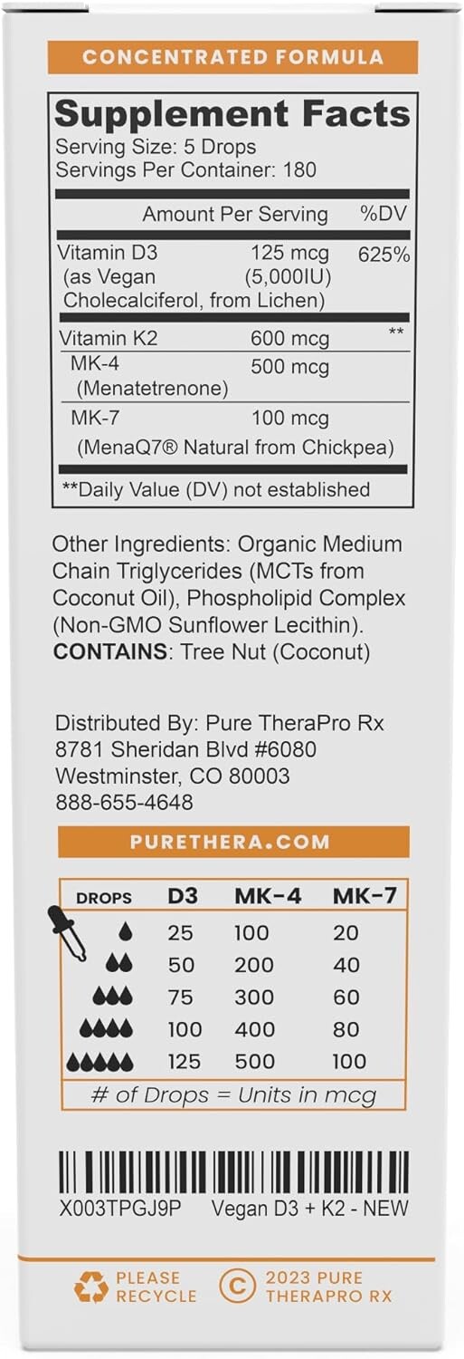 Ингридиенты: Витамин D3 (как веганский холекальциферол из лишайника) 5000 МЕ, витамин K2 600 мкг (как MK-4 [менатетренон] 500 мкг и MK-7 (MenaQ7® как менахинон-7) 100 мкг. Органические триглицериды со средней длиной цепи (ТСЦ из 100% органического кокосового масла), фосфолипидный комплекс (подсолнечный лецитин, не содержащий ГМО).