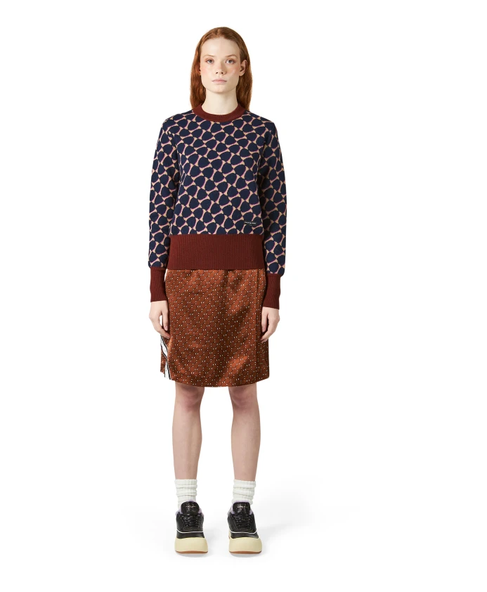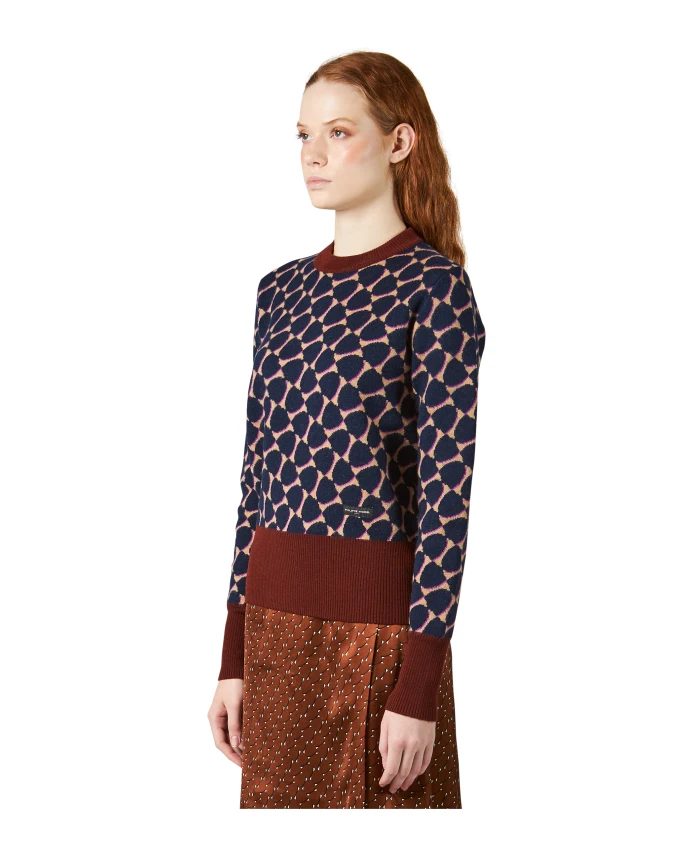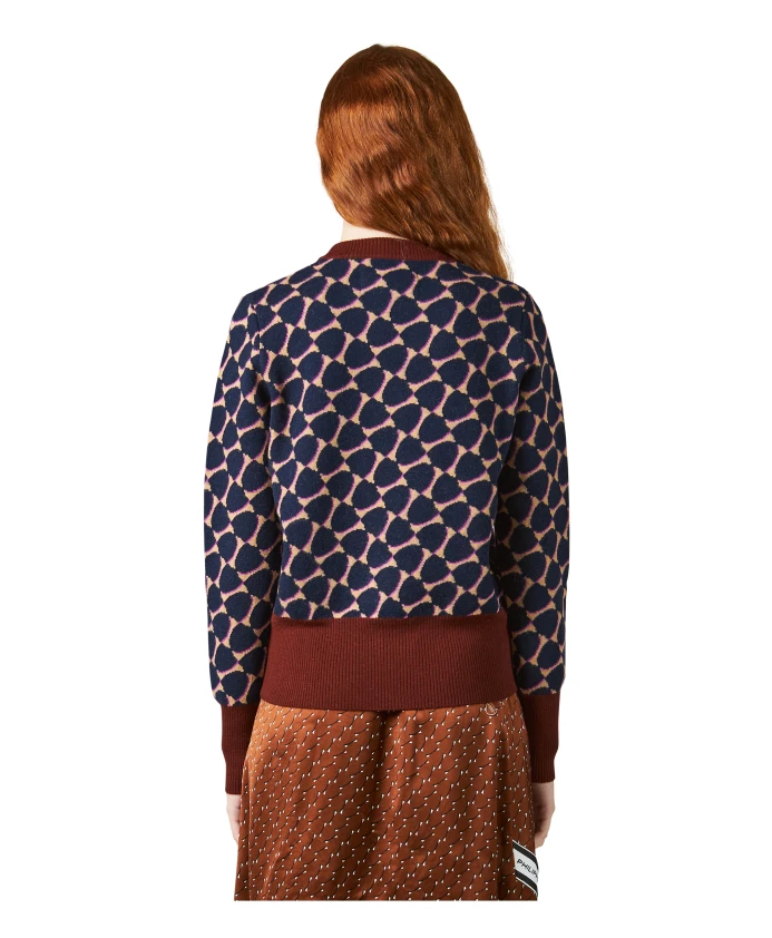 Свитер из очень тонкой ворсистой мериносовой шерсти, украшенный жаккардовой монограммой. С персонализированной этикеткой внизу. Воротник и манжеты выполнены из контрастной ребристой вязки.