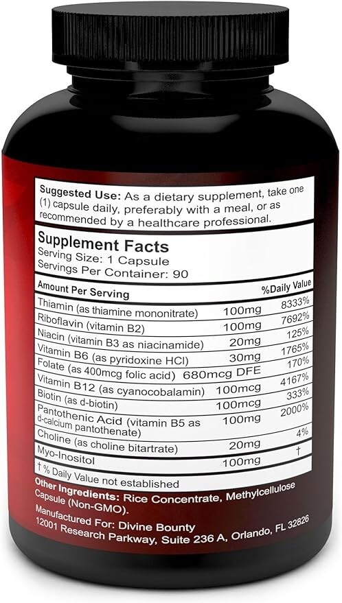 Divine Bounty Vitamin B Complex - это высококачественный комплекс витаминов группы B, предназначенный для поддержки общего здоровья и энергии. Каждая капсула содержит оптимальные дозы витаминов B. Этот продукт разработан с использованием натуральных ингредиентов и не содержит ГМО, глютена, сои или искусственных красителей. Он поддерживает нервную систему, обмен веществ, здоровье кожи и волос, а также улучшает настроение и концентрацию. Комплекс легко усваивается организмом и идеально подходит для ежедневного использования.