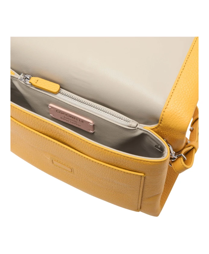 Сумка Coccinelle Dorian на плечо обновляет классический силуэт сумки через плечо благодаря зернистой, обработанной коже и фирменной металлической фурнитуре. Регулируемый ремешок и компактная форма делают ее универсальным выбором для повседневного ношения на плече или в качестве сумки через плечо. Ключевые особенности: Желтый | Солнечно-желтый | Кожа | Прочная кожа | Легко чистится | Мягкая, обработанная отделка | Регулируемый плечевой ремень | Плоская ручка, регулируемая для ношения на плече или через плечо | Накладной передний карман | Внутренний карман на молнии | Несколько отделений | Геометрический силуэт, смягченный зернистой кожей | Невидимая строчка по бокам и на клапане | Металлическая фурнитура на плечевом ремне и передней застежке | Плоская ручка | Размеры и посадка: Высота 16,8 см | Ширина 24,5 см | Глубина 10,7 см | Длина ремешка 110 см | Регулируемый ремешок для ношения на плече или в качестве сумки через плечо | Предназначена для повседневного использования | Состав и уход: Кожа | Протирать мягкой тканью. Избегать агрессивных моющих средств, масел и длительного воздействия тепла или влаги.