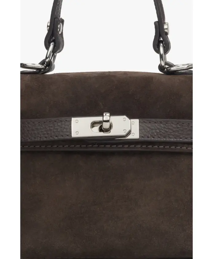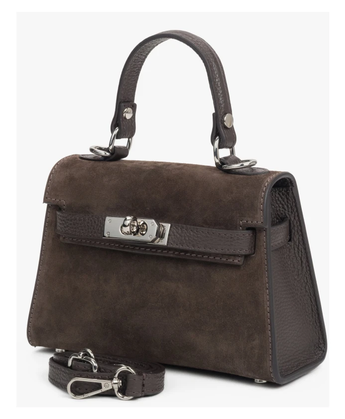Сумка Estro Mini Satchel сочетает в себе компактный, структурированный силуэт с деталями из итальянской замши и кожи, что обеспечивает универсальность в ношении с утра до вечера. Небольшое, удобное внутреннее отделение и регулируемый ремешок делают ее идеальной для стильного хранения необходимых вещей. Ключевые особенности: Коричневый | Итальянская замша | Прочная конструкция | Роскошная кожаная подкладка | Верхняя ручка | Регулируемый длинный плечевой ремень | Основное отделение | Внутренний карман для мелких ценных вещей | Застежка на пряжке | Структурированный силуэт | Деталь на пряжке | Фурнитура серебристого цвета | Размеры и посадка: Ширина: 19,5 см | Высота: 15,5 см | Глубина: 6,5 см | Высота ручки: 8,5 см | Максимальная длина ремешка: 129 см | Отделения: 1 | Карманы: 1 | Застежка: Пряжка | Один размер. Не подходит для формата A4 | Материал и уход: Внешний материал: 100% натуральная замша | Внутренний материал: текстиль и 100% натуральная кожа