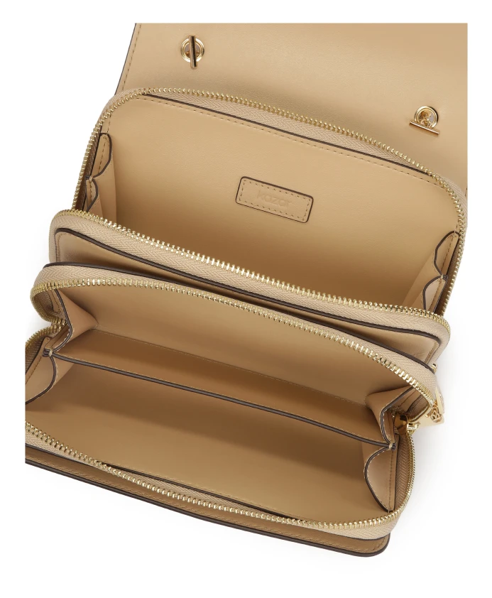 Эта бежевая сумочка, изготовленная из высококачественной натуральной кожи, сочетает в себе элегантность и функциональность. Она имеет четыре отделения, расположенных гармошкой, что придает ей уникальный характер и максимально увеличивает вместимость. Два из этих отделений закрываются на молнию, идеально подходящие для безопасного хранения ценных вещей, а два открытых кармана обеспечивают быстрый доступ к необходимым предметам. Клапан украшен поворотным замком с монограммой KAZAR, добавляя нотку роскоши и подчеркивая индивидуальность. Сумочка висит на элегантном ремешке-цепочке, что позволяет удобно носить ее на плече или через плечо, добавляя шикарный акцент вашему стилю. Детали изделия: Сумочка имеет два отделения на молнии и два открытых отделения, которые дополнительно закрываются клапаном с поворотным замком. В переднем отделении есть два кармана. Плечевой ремешок не отстегивается и не регулируется; его длина составляет 114 см.