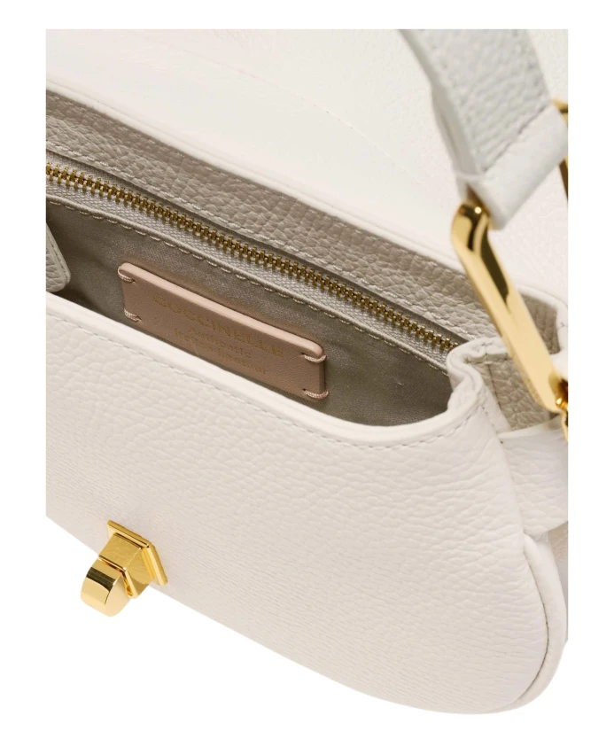 Сумка Coccinelle Magie Soft Mini Bag сочетает в себе изогнутый, округлый силуэт и фирменную застежку-поворотный замок, что делает ее изысканным аксессуаром на каждый день. Изготовленная из мягкой телячьей кожи, она создана для практичного повседневного использования, отличается простотой в уходе и универсальными вариантами ношения. Ключевые особенности: Белый | Телячья кожа | Прочная кожа | Простота в уходе | Мягкая, обработанная поверхность | Застежка-поворотный замок | Регулируемый, съемный плечевой ремень | Компактное внутреннее отделение с карманом на молнии | Изогнутый, округлый силуэт | Деталь в виде поворотного замка | Фурнитура с золотым покрытием | Размеры и посадка: Можно носить на плече или как сумку через плечо | Материал и уход: Телячья кожа | Чистить мягкой влажной тканью; избегать агрессивных моющих средств и дезинфицирующих средств; при необходимости использовать средства по уходу за кожей.