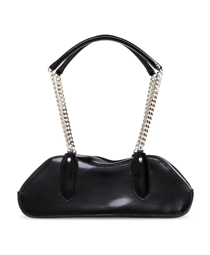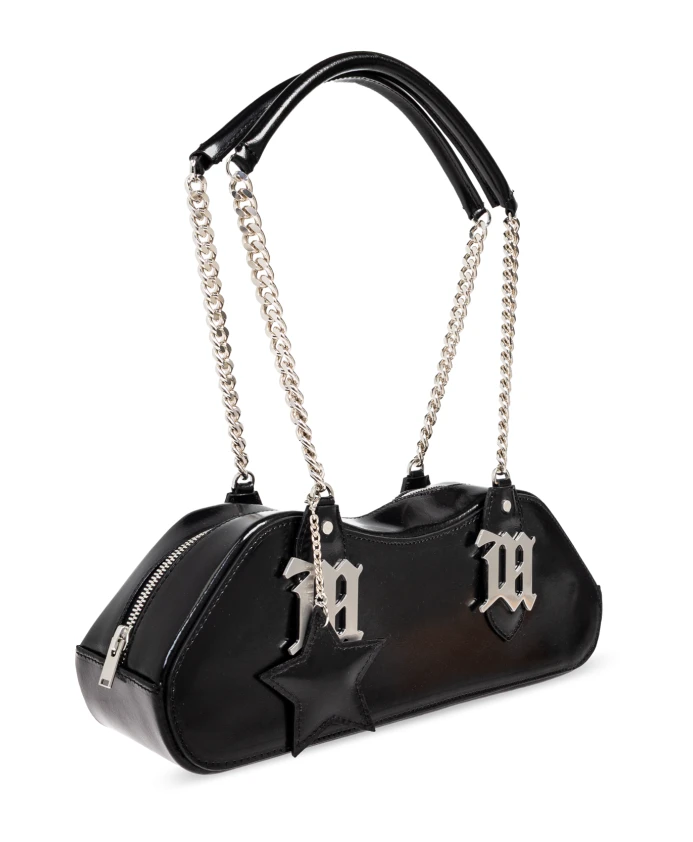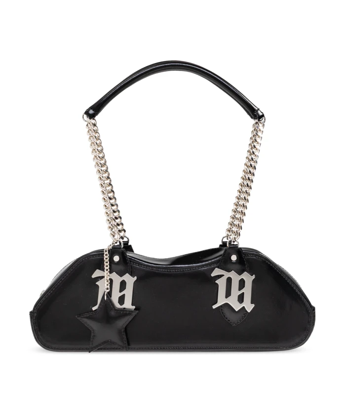 Кожаная сумка через плечо MISBHV сочетает в себе смелую эстетику бренда, вдохновленную мотоциклетным стилем, с элегантным, удлиненным силуэтом. Глянцевая кожаная отделка и фурнитура серебристого цвета делают ее эффектным аксессуаром как для повседневной носки, так и для вечерних мероприятий. Ключевые особенности: Черный | Кожа | Глянцевая полированная кожаная отделка | Кожаный плечевой ремень для удобной переноски | Цепочки в качестве декоративных и структурных элементов | Удлиненная прямоугольная форма с едва закругленными краями | Фурнитура и цепочка серебристого цвета | Стилизованный логотип «M» и кожаный брелок в виде звезды | Размеры и посадка: Высота: 12 см | Ширина: 34 см | Состав и уход: 100% натуральная коровья кожа | Металлическая фурнитура | Протирать мягкой влажной тканью; избегать длительного воздействия воды и тепла; хранить в пылезащитном мешке, когда не используется.