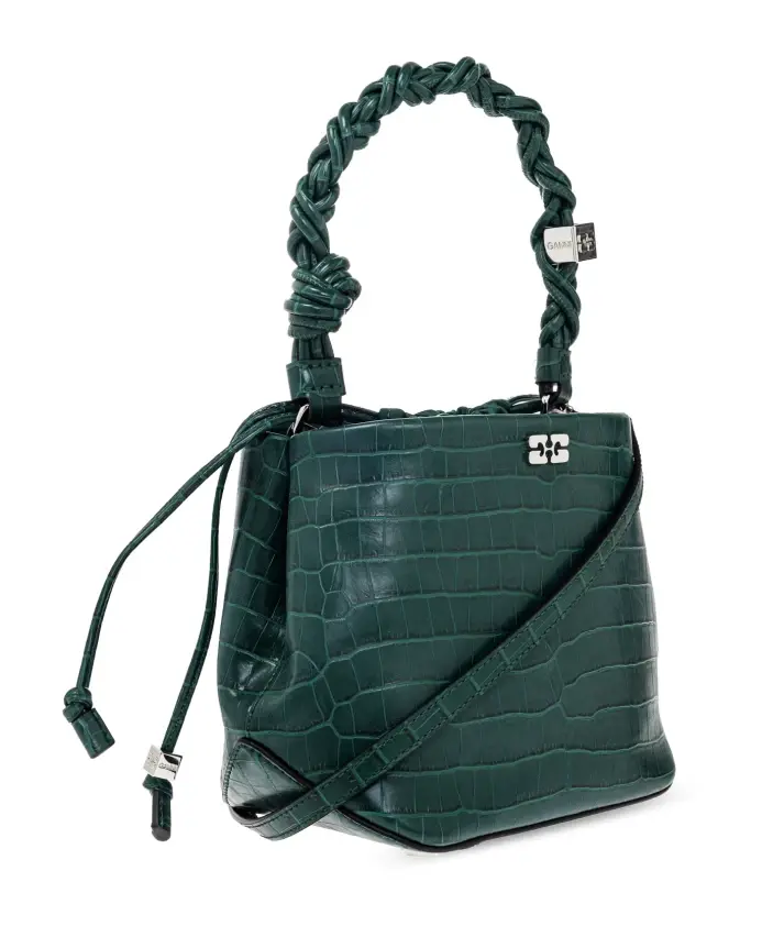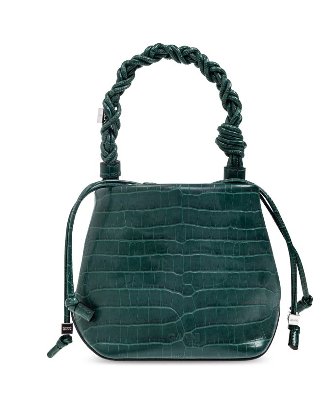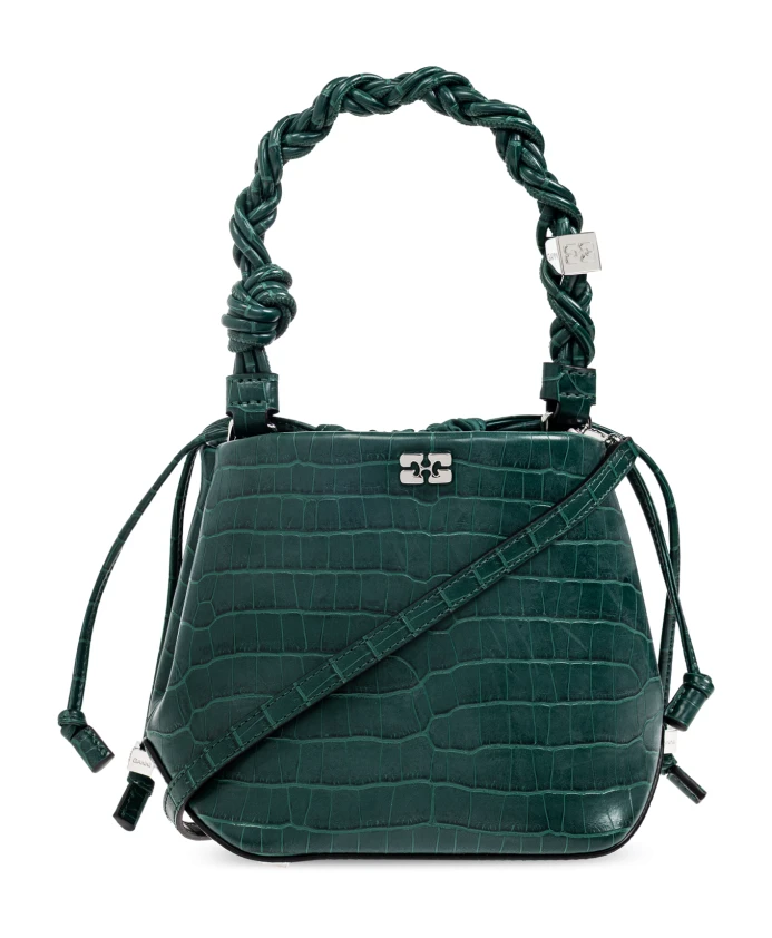 Сумка-ведро Ganni Bou - это компактная сумка-ведро, отличающаяся тиснением под крокодиловую кожу и эффектной плетеной ручкой. Она сочетает в себе структурированный силуэт ведра с практичными функциями для повседневного использования. Ключевые особенности: Цвет: Сосново-зеленый | Кожа | Плетеная ручка | Регулируемый и съемный плечевой ремень | Застежка на шнурке | Несъемный внутренний карман | Плоский внутренний слот для карт | Текстура, имитирующая крокодиловую кожу | Силуэт ведра | Плетеная ручка с узлом | Металлический логотип золотистого цвета | Застежка на шнурке | Размеры и посадка: Длина ремня: 50 см | Высота: 18 см | Ширина: 18,5 см | Глубина: 13 см | Состав и уход: 51% кожа, 23% TENCEL лиоцелл, 26% полиуретан | Подкладка: 100% полиэстер