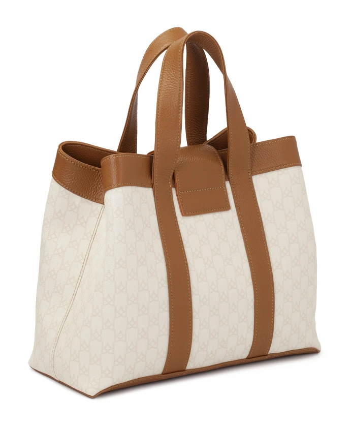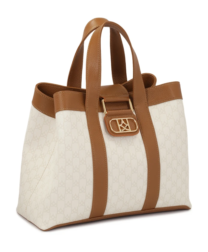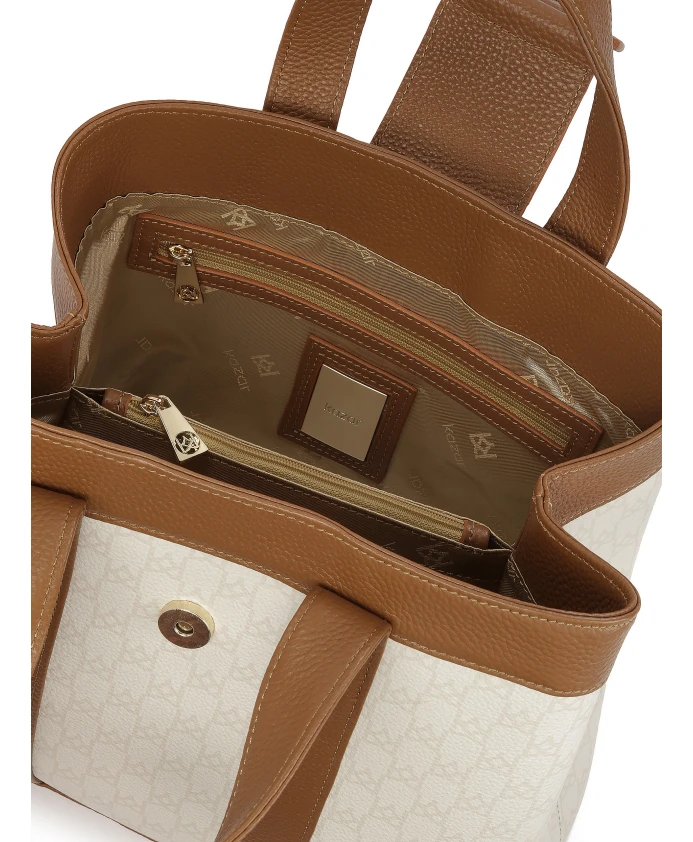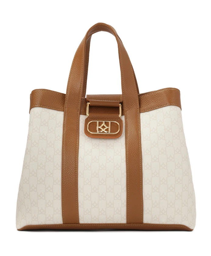Эта элегантная сумка из натуральной кожи впечатляет изысканным сочетанием двух цветов - светло-коричневого и кремового. Светлая часть украшена едва заметным логотипом компании, состоящим из небольших монограмм. Декоративная металлическая застежка сочетает в себе функциональность и эстетику. В золотистых тонах она подчеркивает эксклюзивный характер сумки, добавляет элегантности и гармонично завершает дизайн. Эта повседневная, вместительная сумка станет идеальным аксессуаром как для ежедневного использования, так и для особых случаев. Детали изделия: Сумка имеет одно основное отделение с магнитной застежкой. Внутри расположены два открытых кармана и один карман на молнии, а также один открытый карман и один карман на молнии.