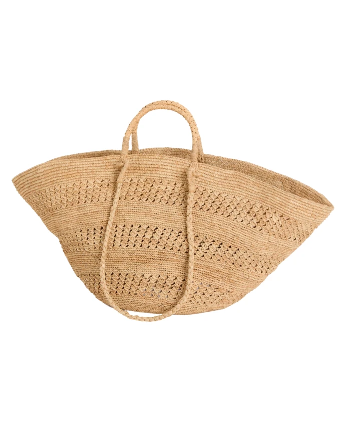 Сумка-тоут Sol от Ibeliv - это большая, изготовленная вручную сумка из 100% натуральной рафии, идеально подходящая для тех, кто ищет стиль и долговечность в одном изделии. Ее легкий вес и прочная конструкция делают ее идеальной для повседневного использования. Ключевые характеристики: Цвет: Бежевый | Материал: 100% натуральная рафия | Легкая | Прочная | Ручки и лямки из плетеной рафии | Полностью связана крючком | Размеры и посадка: 80 см в самой длинной точке | 35 см в высоту | Состав и уход: 100% натуральная рафия | Легко чистится слегка влажной губкой; при необходимости добавьте нейтральное мыло.