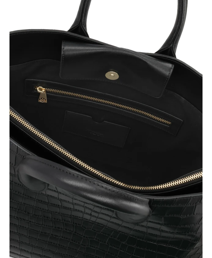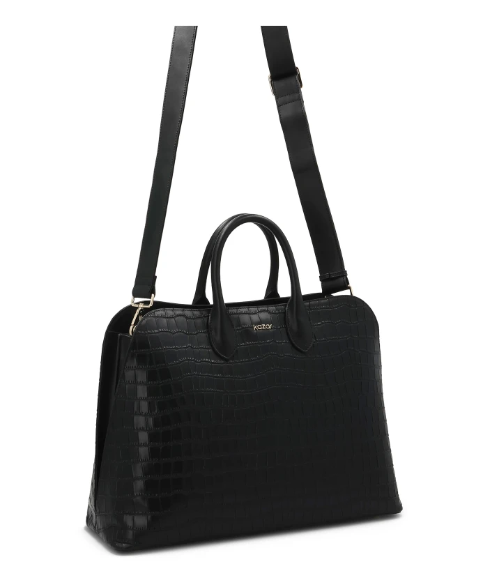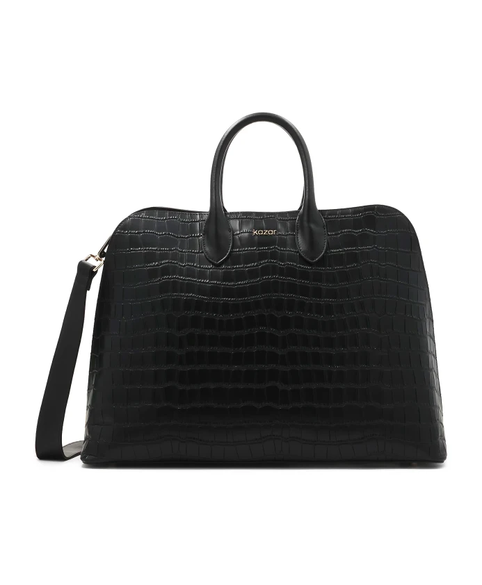 Сумка Kazar из тисненой кожи сочетает в себе классический, структурированный силуэт с тиснением под крокодиловую кожу и глянцевой отделкой, предлагая универсальные варианты ношения в руке или через плечо. Ключевые особенности: Черный | Кожа | Структурированная форма | Две ручки для переноски | Регулируемый, съемный плечевой/кроссбоди ремень | Зажимы для крепления ремня | Тиснение под крокодиловую кожу | Закругленный силуэт | Жесткая конструкция | Глянцевая отделка | Фурнитура золотистого цвета | Состав и уход: Кожа