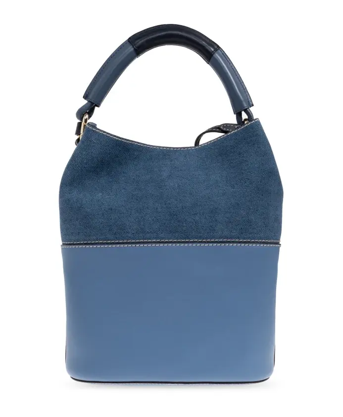 Сумка SFERA SMALL HANDBAG - уникальный выбор для женщин, ценящих изысканный стиль и современность. Ее форма напоминает классическую сумку-ведро, слегка сужающуюся кверху, что прекрасно гармонирует с плавно закругленным основанием. Двухцветная композиция - сочетание гладкой натуральной кожи внизу и изысканной замши или нубука синего оттенка вверху - создает исключительный текстурный контраст. Внимание привлекает тонкая золотая отделка.