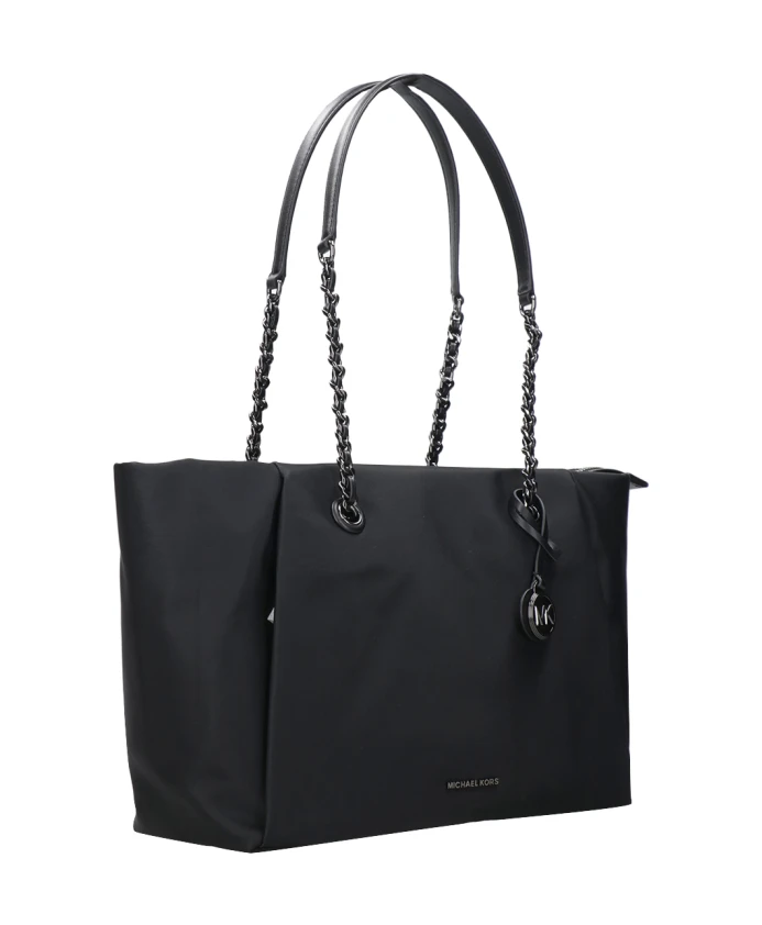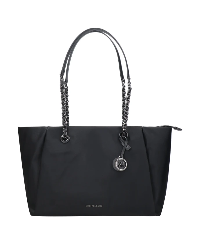 Подчеркните свой стиль с помощью этой женской сумки-тоут от Michael Kors. Изготовленная из технологичной ткани, она имеет два вертикальных кармана на молнии спереди, металлическую застежку сверху и ручки из антрацитовой металлической цепочки. Вместительное основное отделение вмещает предметы формата А4 и включает дополнительный карман на молнии для удобной организации вещей. Размеры: Ш 40 см x В 29 см x Г 15 см.