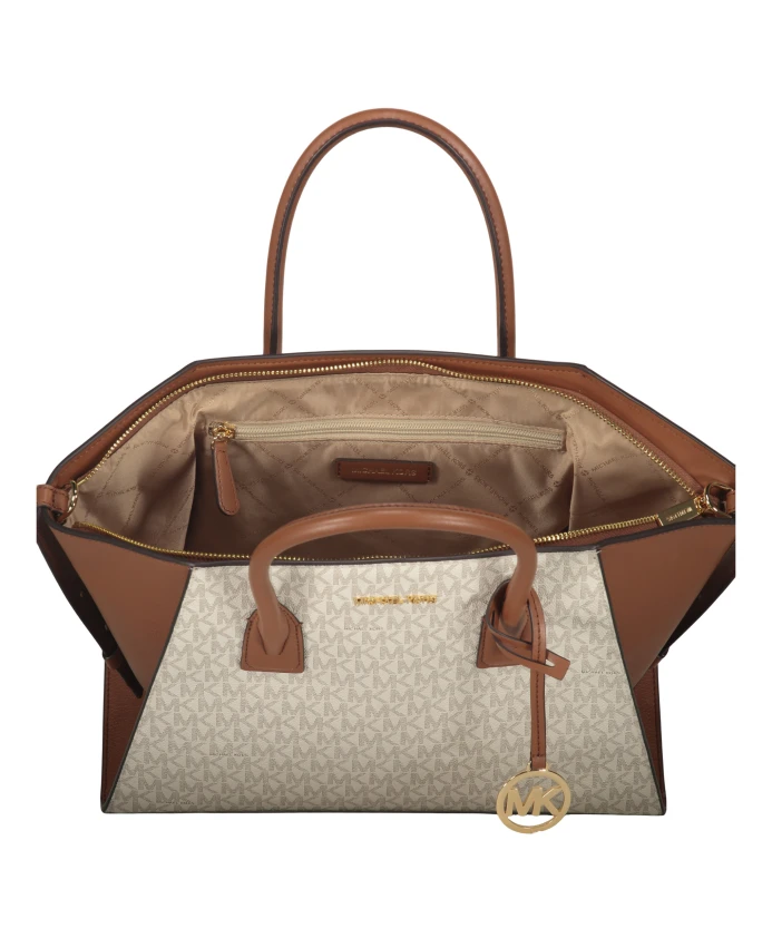 Подчеркните свой стиль с помощью этой элегантной сумочки от Michael Kors. Сумочка имеет застежку-молнию сверху, две кожаные ручки и просторное внутреннее отделение с множеством карманов. Изготовлена из высококачественных материалов и украшена подкладкой с культовым логотипом Michael Kors. Размеры: Ш 32 см x В 25 см x Г 16 см. Длина ремешка: 120 см. Состав: 90% ПВХ, 9% полиэстер, 1% полиуретан.