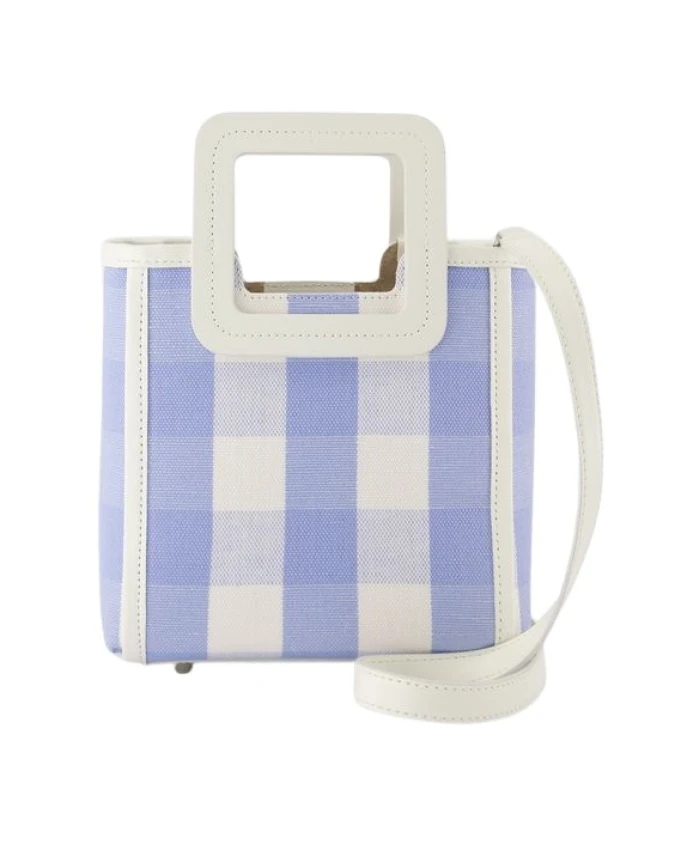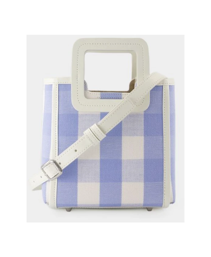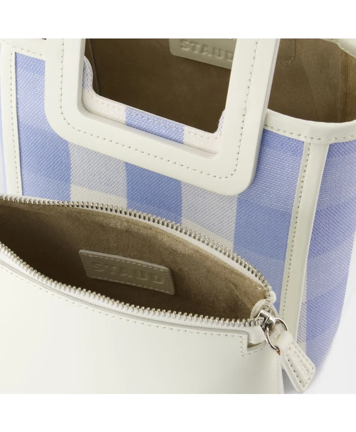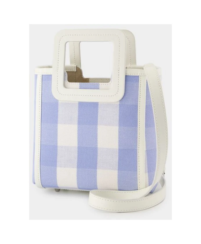 Подчеркните свой стиль с помощью этой сумки STAUD из гладкой телячьей кожи, с верхними ручками, клапаном на магнитной застежке и универсальным дизайном, подходящим как для ручной работы, так и для повседневного использования. Доступна в сине-голубом цвете в клетку. Изготовлена из 100% коровьей кожи. Европейский размер. Размеры: ширина 24 см, высота 19 см, длина 10 см.