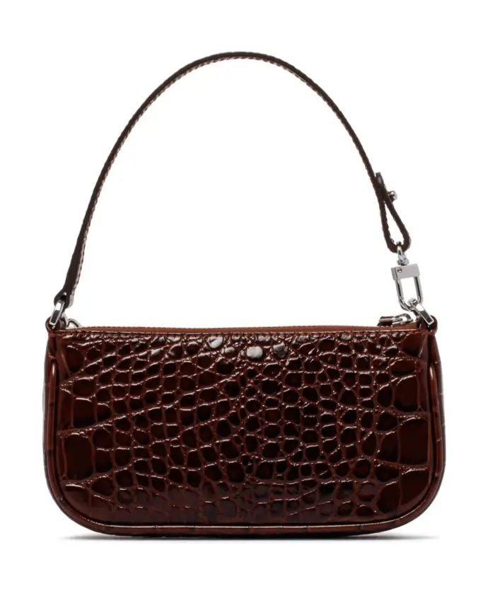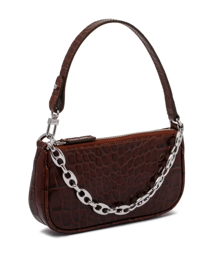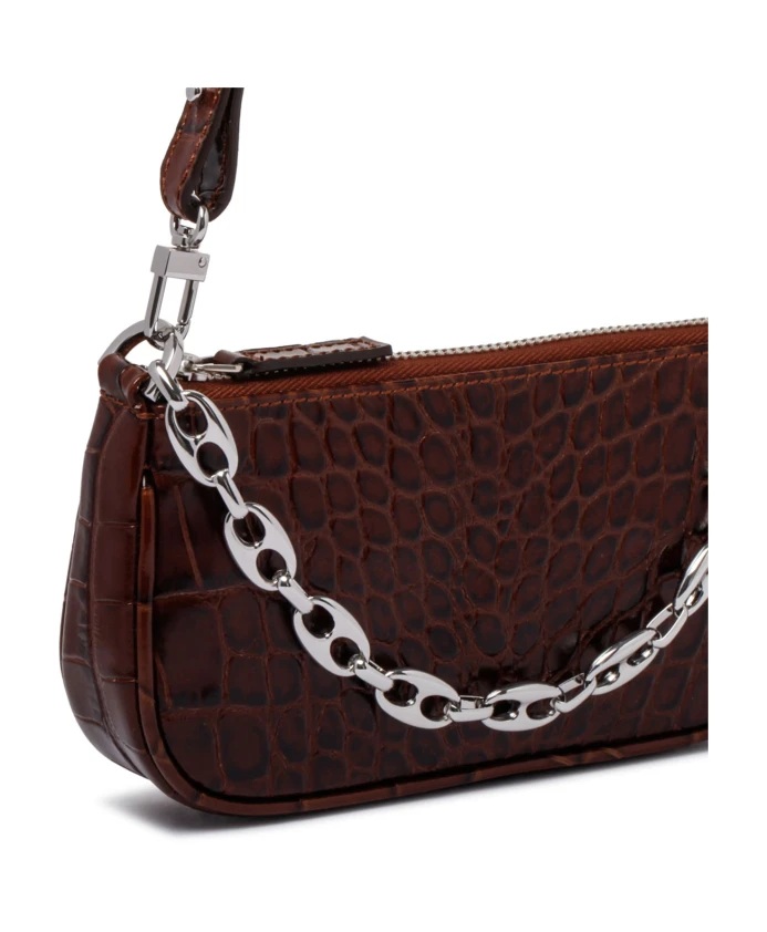 Подчеркните свой стиль с помощью коричневой мини-сумочки By Far Rachel. Эта коричневая сумочка, изготовленная из кожи с тиснением под крокодила, украшена элегантной металлической цепочкой спереди. Сумочка имеет частично съемную кожаную ручку, застежку-молнию и подкладку внутри.