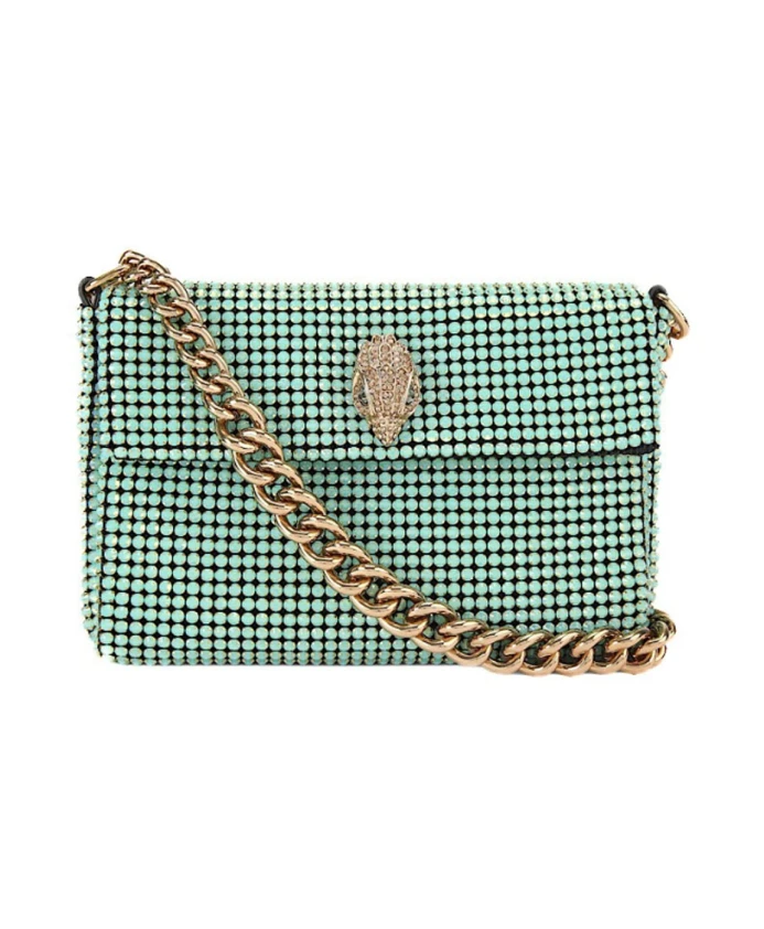 Подчеркните свой стиль с помощью этой сумки через плечо от Kurt Geiger. Миниатюрная сумка Borsetta, украшенная кристаллами, имеет мягкую внешнюю поверхность, отделанную зелеными кристаллами, и золотистую голову орла, также украшенную кристаллами, на переднем клапане.