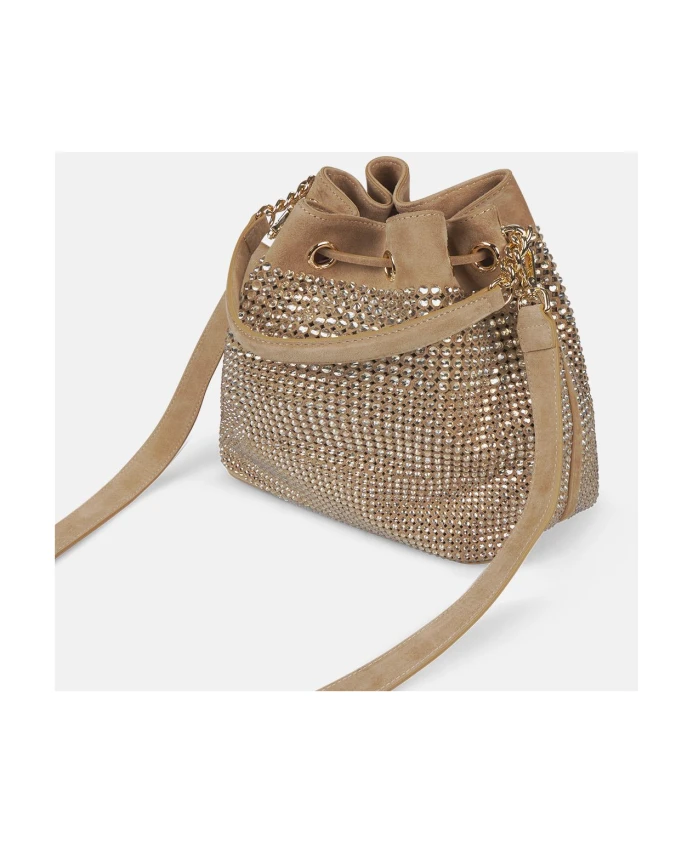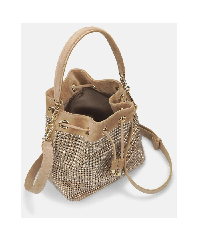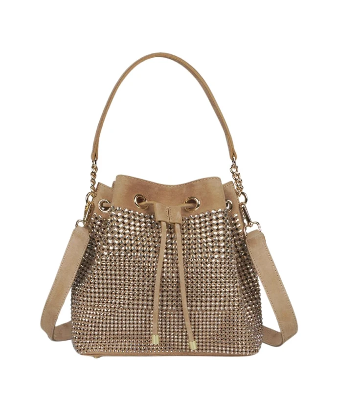 Мешочек для конфет с отделкой из страз, изготовленный из ткани с тканевой подкладкой. Регулируемая застежка. Круглая металлическая ручка и металлический цепочный плечевой ремень.