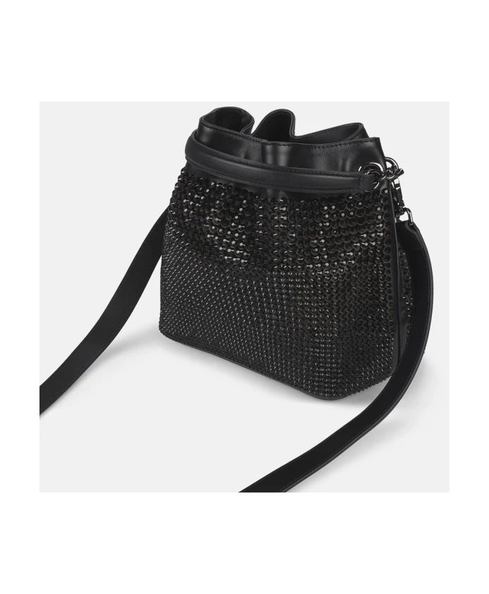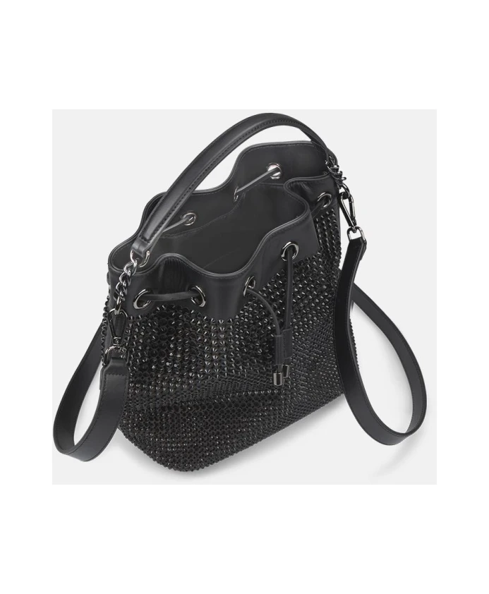 Мешочек для конфет с отделкой из страз, изготовленный из ткани с тканевой подкладкой. Регулируемая застежка. Круглая металлическая ручка и металлический цепочный плечевой ремень.