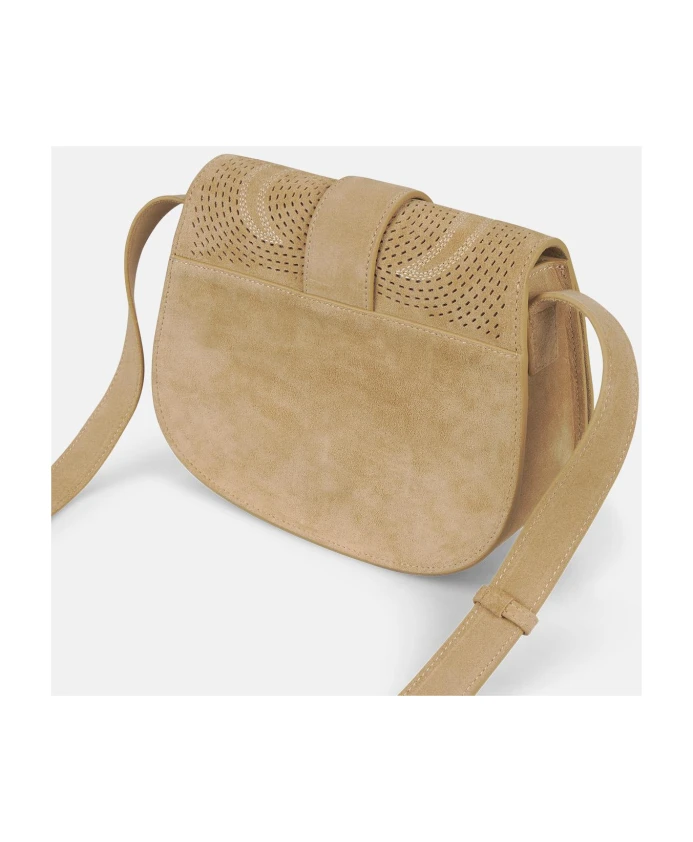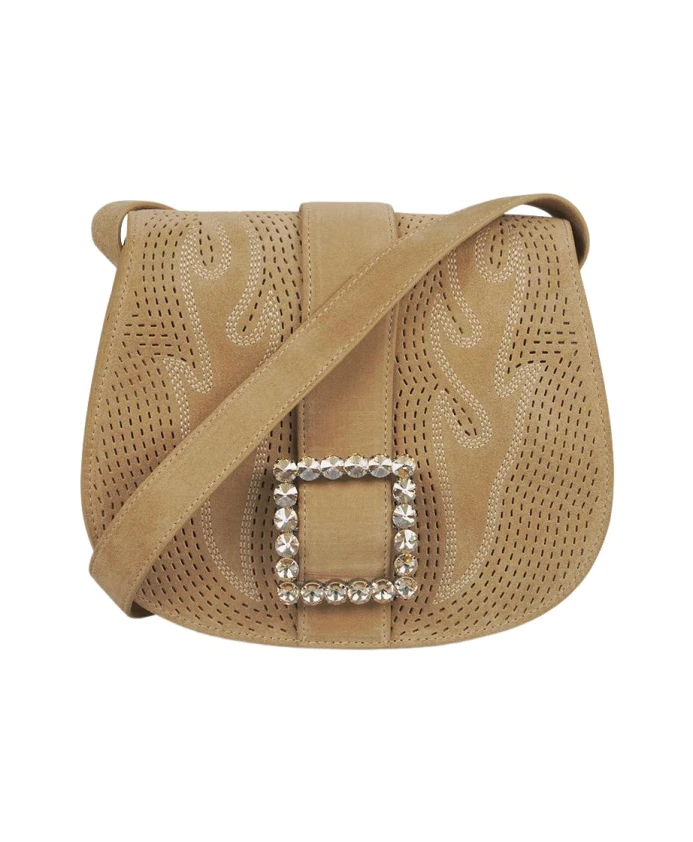 Сумка через плечо с ажурной отделкой на клапане. Деталь с пряжкой и стразами. Текстильная подкладка. Магнитная застежка.