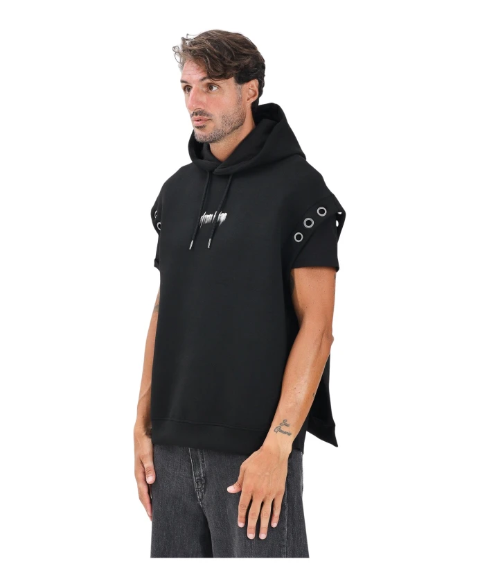 Подчеркните свой городской стиль с помощью этой черной мужской худи без рукавов от ARMANI EXCHANGE. Регулируемый капюшон и декоративные металлические люверсы на плечах придают ей современный вид. На спине - белый принт с эффектом распыления и логотипом Armani Exchange в стиле граффити, а спереди - минималистичный белый графический рисунок. Удобный крой и мягкая ткань делают ее идеальной для создания модных уличных образов. Модель носит размер M, рост 190 см. Рекомендуется стирка и глажка при средней температуре. Сезон осень/зима. Черная мужская худи, стандартный крой, осень/зима XM001384AF18746UC001. Состав ткани: 56% полиэфирная нить, 35% вискоэластичная нить, 9% сульфидная нить.