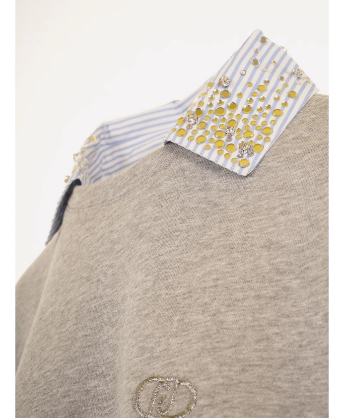 Толстовка Liu Jo со стразами сочетает в себе мягкую хлопковую смесь и воротник, украшенный стразами, создавая изысканный повседневный образ. Круглый вырез горловины добавляет элегантности повседневным нарядам. Ключевые особенности: Серый | Хлопковая смесь | Круглый вырез горловины | Воротник, украшенный стразами | Вышитый логотип на груди | Состав и уход: Внешняя ткань: 80% хлопок, 20% полиэстер | Вторичная ткань: 100% хлопок | Ручная стирка; стирать отдельно и вывернув наизнанку; перед стиркой вынимать аксессуары. Не отбеливать; не сушить в сушильной машине; не подвергать химчистке. Гладить при температуре не выше 110°C, используя ткань; не гладить декоративные элементы.