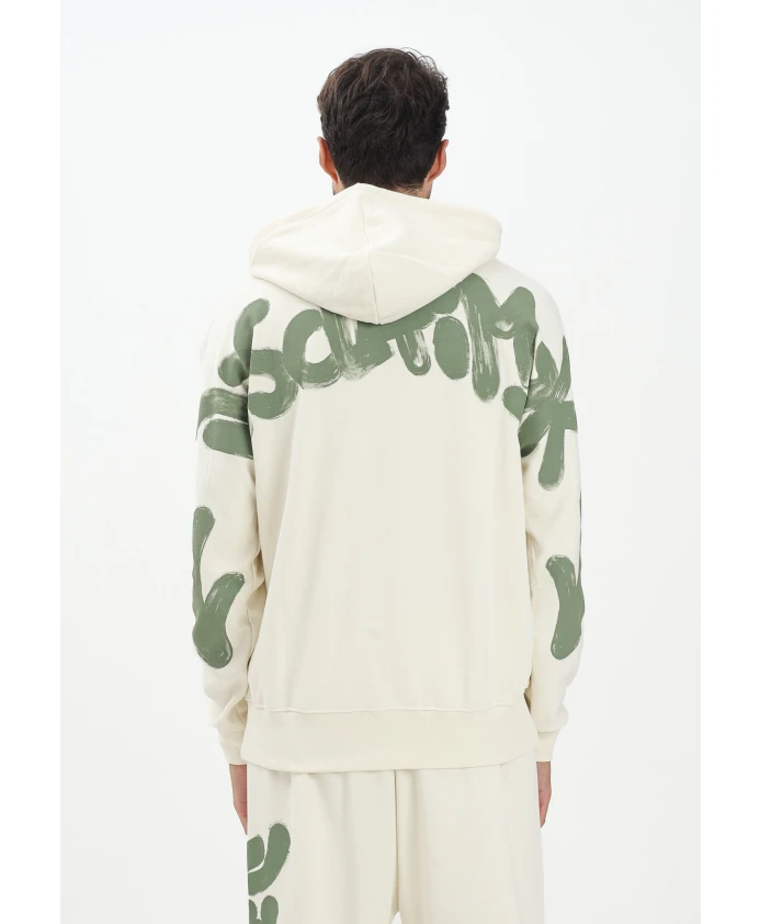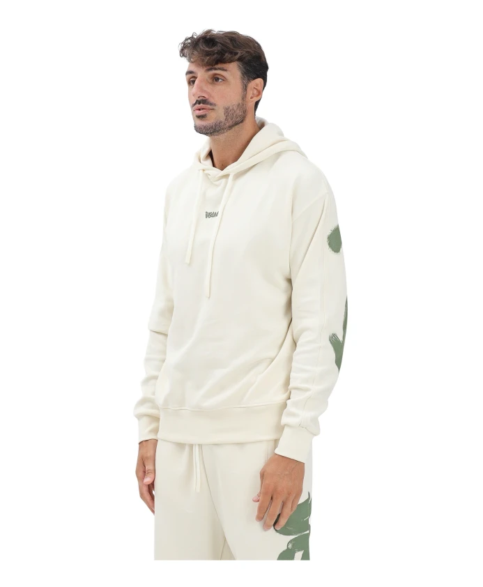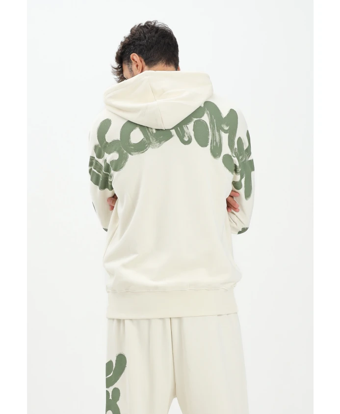 ВНИМАНИЕ! Мужская худи кремового цвета удобного кроя в стиле стритвеар. С небольшим логотипом в тон на передней части и крупным зеленым графическим рисунком в виде мазков кисти на рукавах и спине, отражающим урбанистический дух бренда. Худи имеет регулируемый капюшон на шнурке и ребристые манжеты для комфорта и практичности. Современная и смелая худи, идеально подходящая для современного повседневного образа. Модель носит размер L, рост 187 см. Рекомендуется стирка и глажка при средней температуре. Мужская худи кремового цвета стандартного кроя для осенне-зимнего сезона 25IDS55100LAVE.