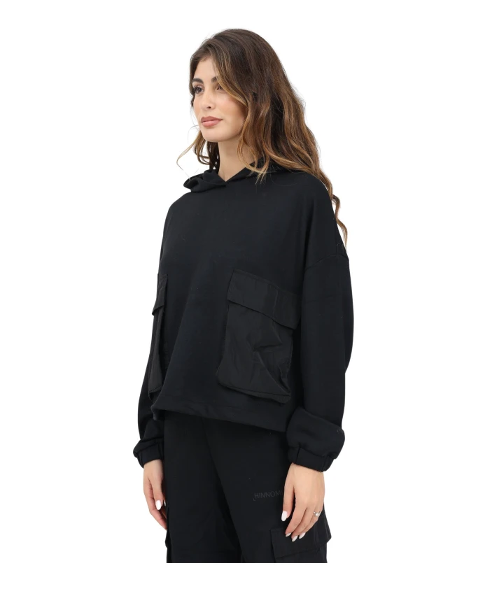 Женская худи HINNOMINATE черного цвета. Эта худи свободного кроя сочетает в себе городской стиль и функциональность, с большими накладными карманами из технической ткани спереди для современного акцента. Свободный крой и приспущенные плечи обеспечивают исключительный комфорт, а капюшон добавляет практичности в прохладные дни. Нижний край худи регулируется внутренними шнурками. Модель носит размер S, рост 170 см. Рекомендуется стирка и глажка при средней температуре. Сезон осень/зима. Женская худи свободного кроя черного цвета для осени/зимы HMABW01068NE01.