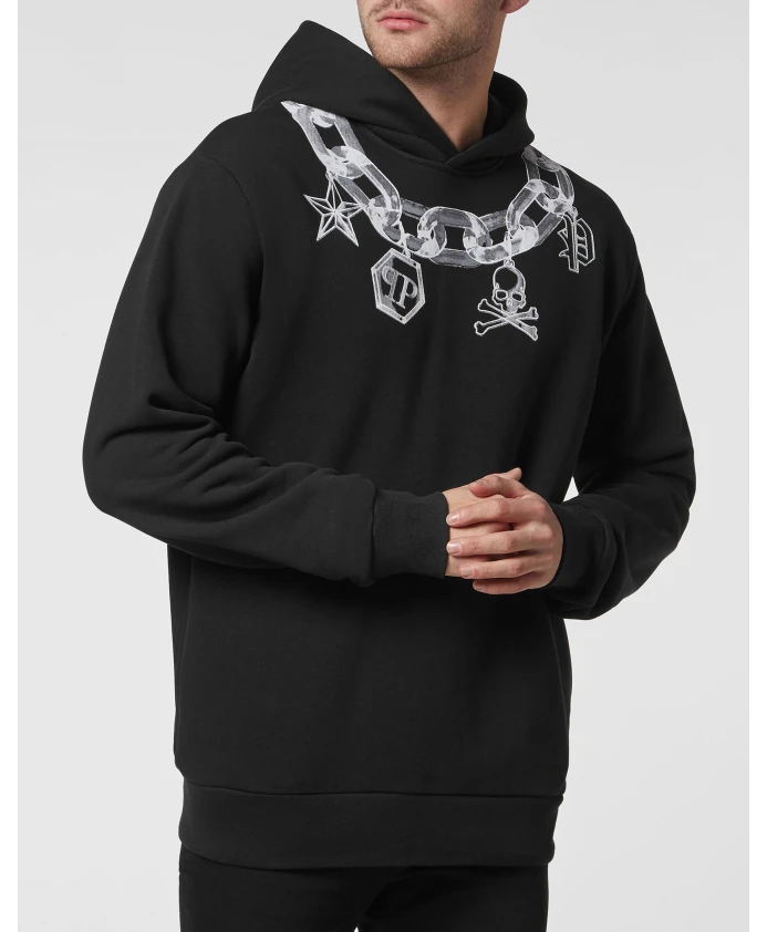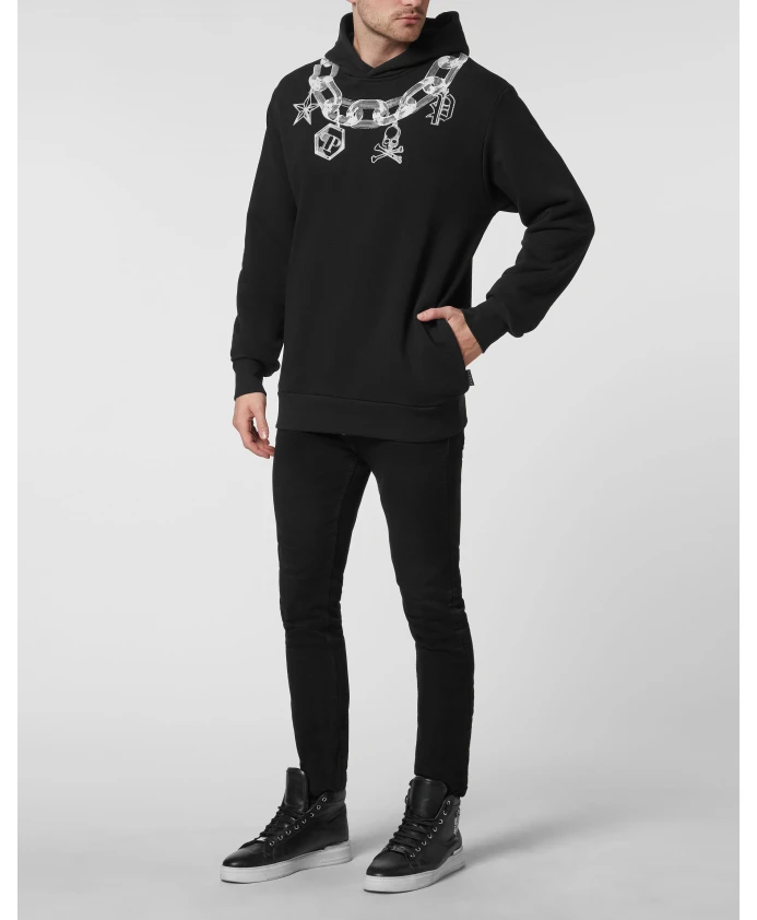Толстовка с капюшоном Philipp Plein выполнена из хлопкового флиса и украшена принтом в виде цепочек с культовыми подвесками бренда, а также шестиугольной нашивкой из сафьяновой кожи на капюшоне. Основные характеристики: Черный цвет | Хлопковый флис | Капюшон | Ребристые манжеты | Ребристый низ | Принт в виде цепочек с культовыми подвесками бренда | Нашивка из сафьяновой кожи с пришитым шестиугольником из сафьяновой кожи на капюшоне | Капюшон | Ребристые манжеты и низ | Состав и уход: 88% хлопок, 12% полиэстер | Сафьяновая кожа (нашивка)