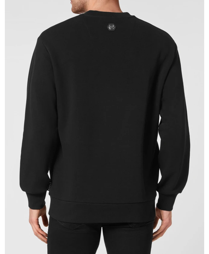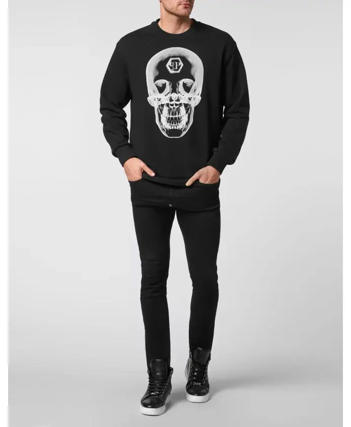 Толстовка с длинными рукавами Philipp Plein - это пуловер из хлопкового флиса с круглым вырезом, украшенный культовым цифровым принтом в виде черепа и шестиугольной нашивкой из сафьяновой кожи PP на кокетке, создающей эффектный повседневный образ. Ключевые особенности: Черный | Хлопковый флис | Ребристые манжеты и нижний край | Круглый вырез | Цифровой принт в виде черепа спереди | Шестиугольная нашивка из сафьяновой кожи PP на кокетке | Размеры и посадка: Свободный крой | Состав и уход: 88% хлопок, 12% полиэстер