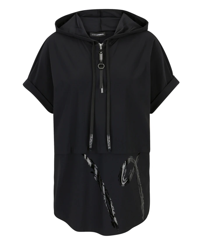 Оставайтесь стильной и чувствуйте себя комфортно в этой удобной тунике-рубашке с капюшоном от Doris Streich. Изготовленная из высокоэластичной ткани, эта рубашка украшена декоративным принтом в глянцевом черном цвете, хромированной молнией с декоративным язычком и силиконовым шнурком в капюшоне для аккуратного вида. Эластичный материал и глубокая складка на спине обеспечивают максимальный комфорт. Состав: 75% полиамид, 25% эластан.