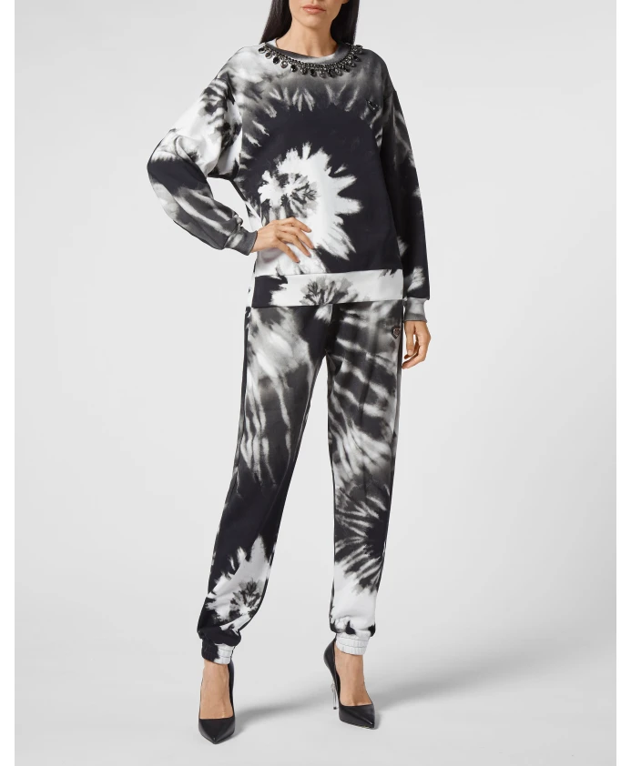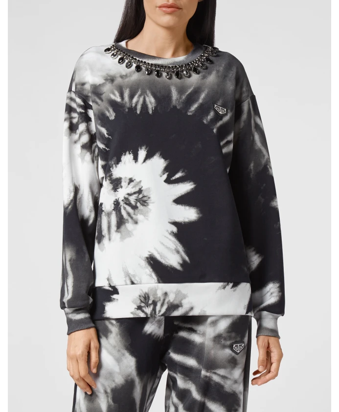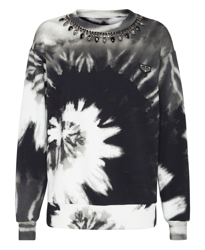 Свитшот Philipp Plein с принтом тай-дай сочетает в себе монохромный узор тай-дай и детали из страз, создавая эффектный повседневный образ. Круглый вырез горловины и логотип на левой стороне груди придают ему узнаваемый дизайнерский стиль. Ключевые особенности: Черный | Белый | Хлопок | Круглый вырез горловины | Монохромный принт тай-дай | Аппликации из страз | Логотип на левой стороне груди | Ребристые манжеты