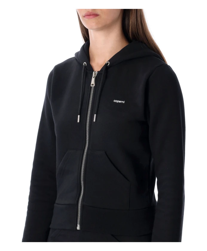 Худи на молнии от Coperni сочетает в себе спортивную функциональность и лаконичный дизайн. Изготовленная из хлопковой смеси, она имеет регулируемый капюшон на шнурке, молнию во всю длину и разрезной карман-кенгуру спереди. Принт с логотипом на груди, ребристые манжеты и нижний край дополняют образ, делая ее универсальным элементом гардероба как для повседневных образов, так и для современной городской моды.