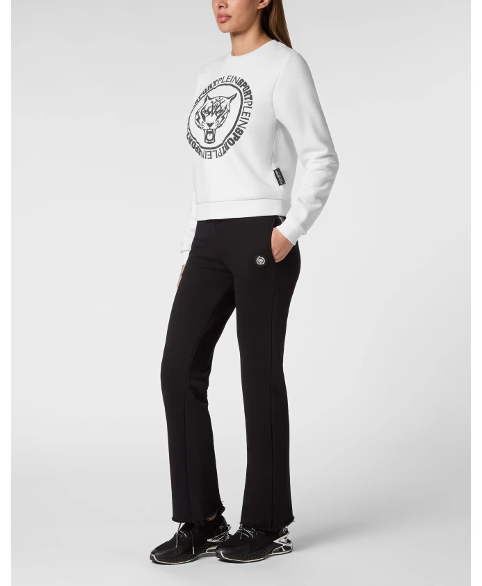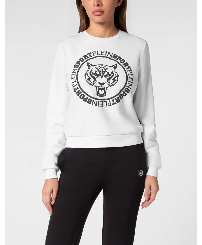 Свитшот Plein Sport, созданный для тренировок и отдыха, украшен культовым тигровым мотивом бренда и имеет укороченный силуэт для современного образа. Ключевые особенности: Белый | Хлопковый флис | Тигровый мотив на передней части | Укороченный силуэт | Ребристые манжеты | Размеры и посадка: Укороченный крой | Состав материала и уход: Хлопковый флис