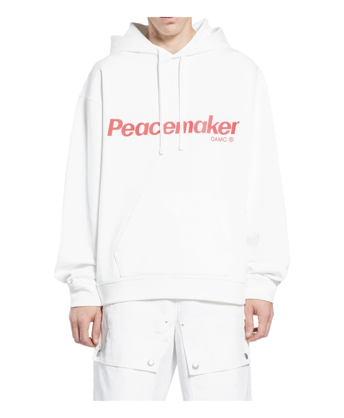 Подчеркните свой уличный стиль с помощью этой белоснежной хлопковой толстовки с принтом «миротворец» на передней части, карманом-кенгуру, свободными плечами, длинными рукавами, цветочным узором на спине, а также ребристым низом и манжетами. Эта толстовка свободного кроя - обязательный элемент гардероба для мужчин. Модель носит размер M.